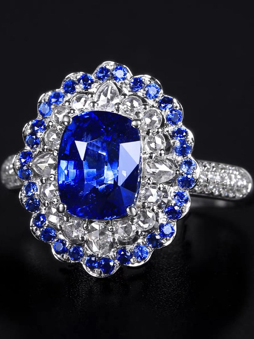 A captivating royal blue sapphire takes center stage in this elegant ring, its cushion cut radiating with depth and brilliance. The vibrant sapphire is framed by a halo of sparkling white diamonds and accented further by a delicate circle of smaller blue sapphires, creating a breathtaking contrast of fire and color. The band is crafted in polished white gold or platinum, with additional pavé-set diamonds adding extra shimmer and luxury