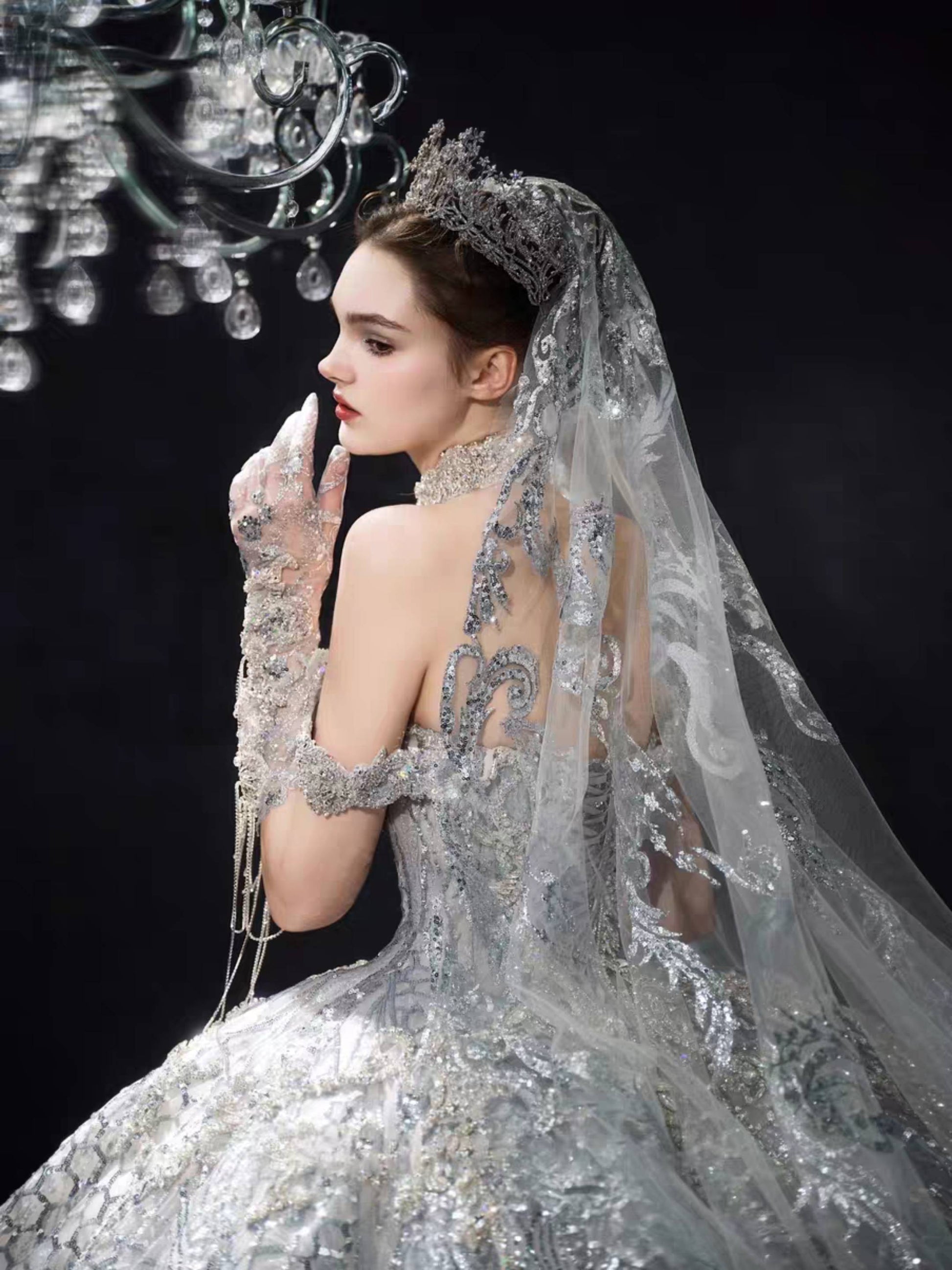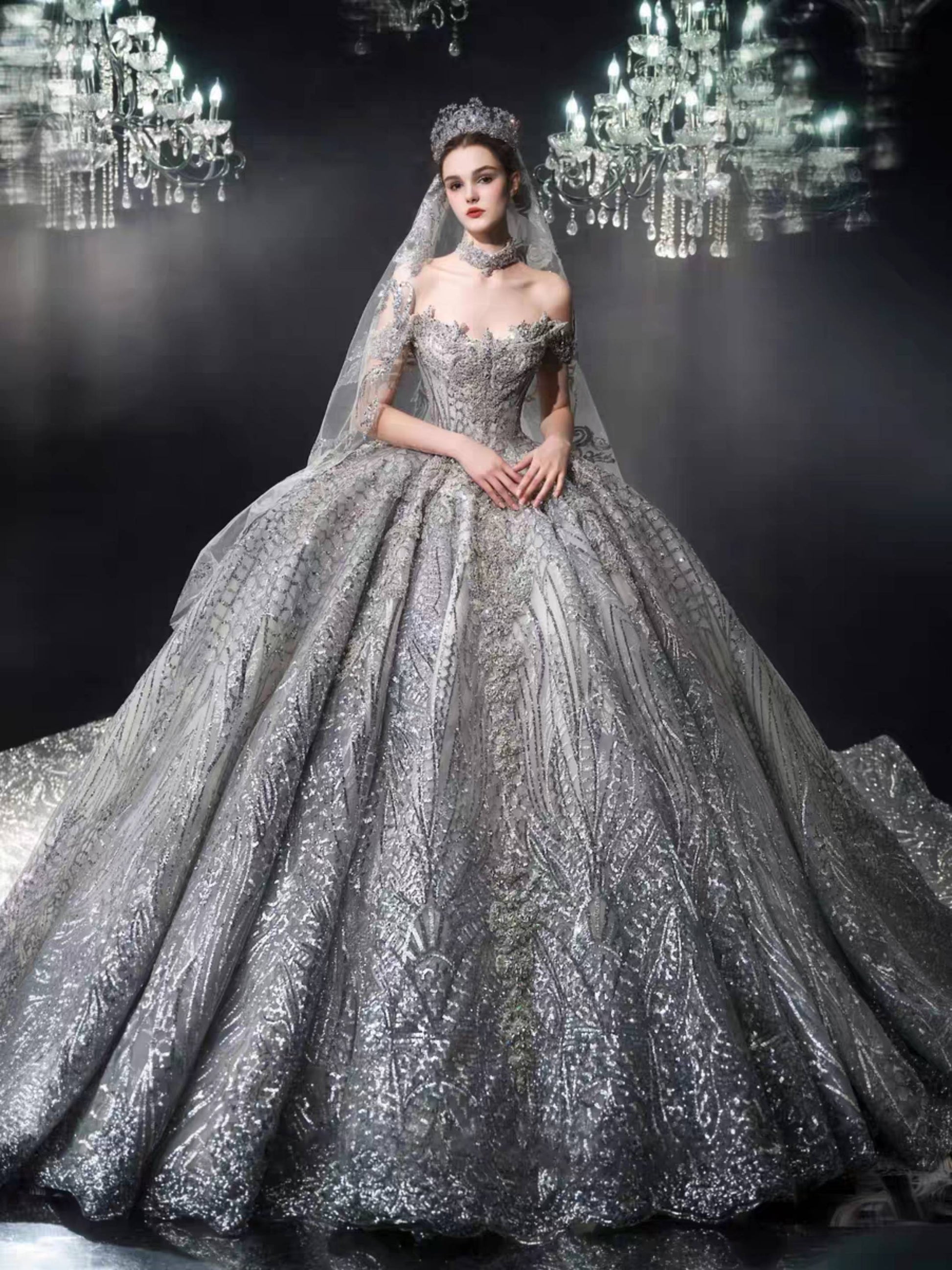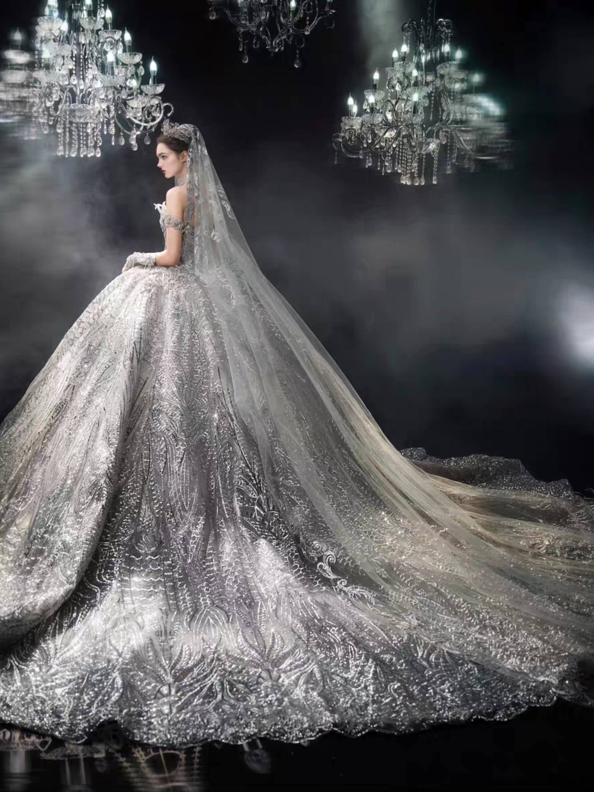 A sweeping cathedral train extends with dramatic elegance, and the veil — light as mist beneath chandeliers — shimmers with ethereal brilliance. Every detail is a testament to majesty, designed to capture both reverence and awe