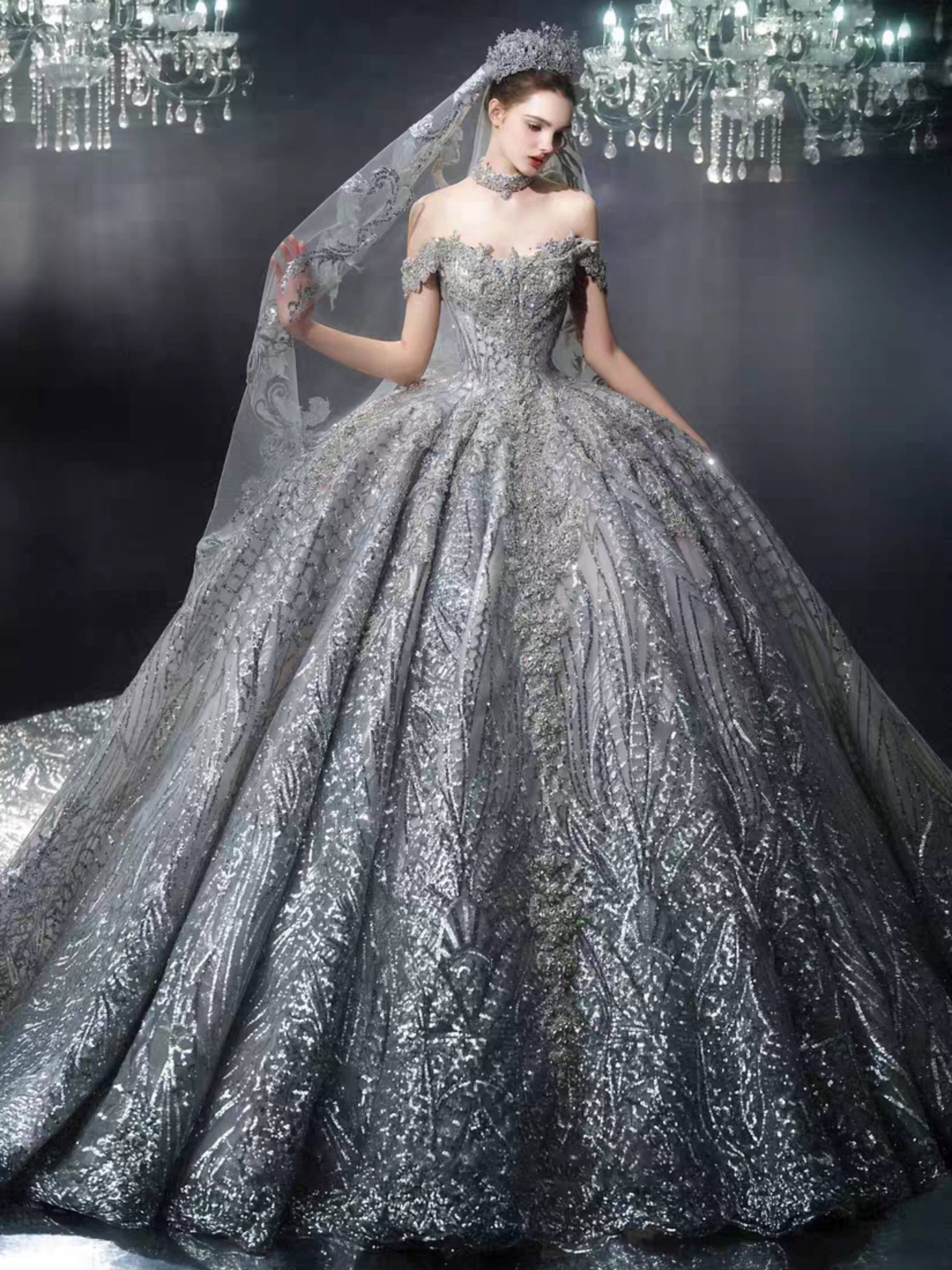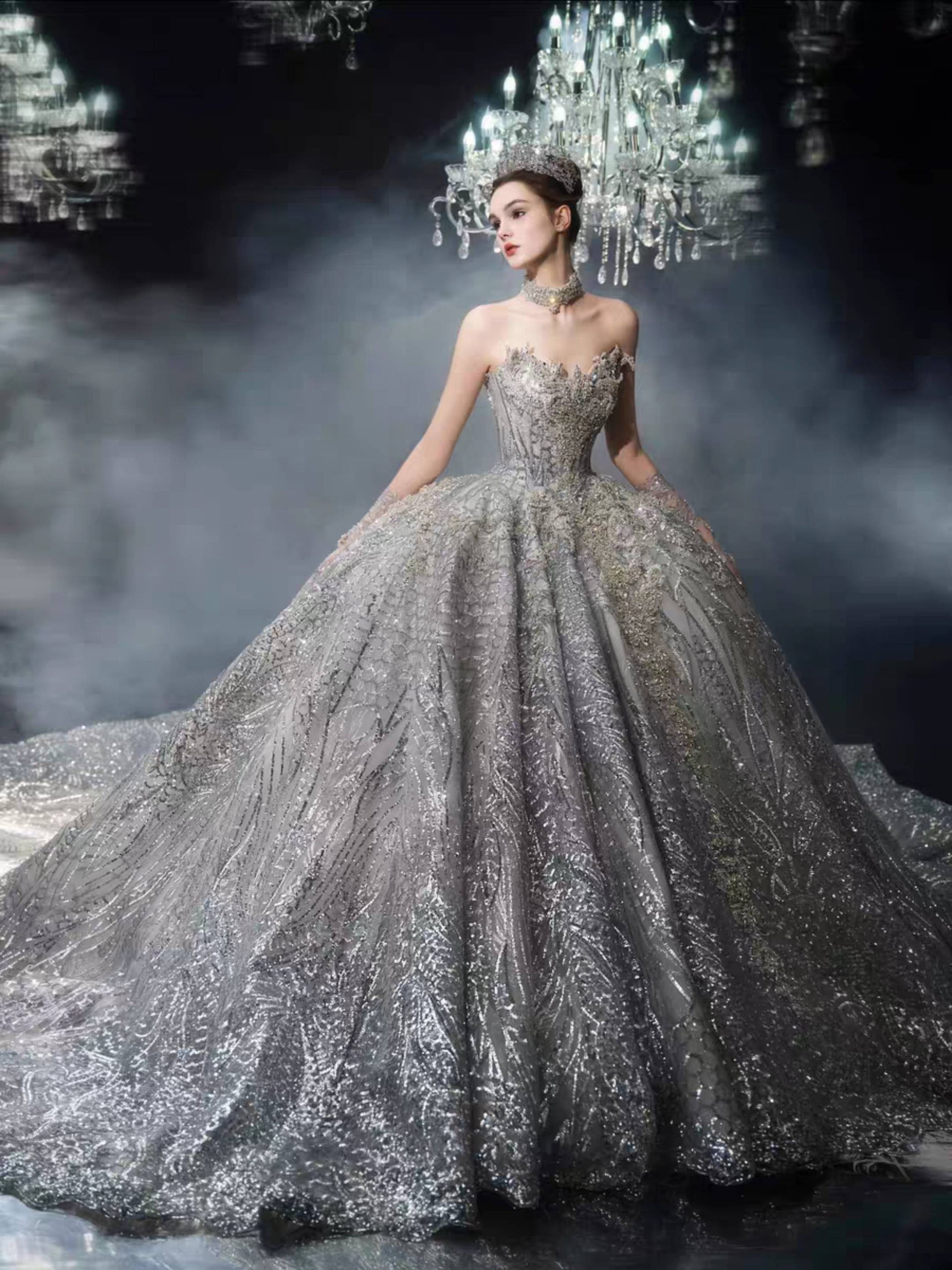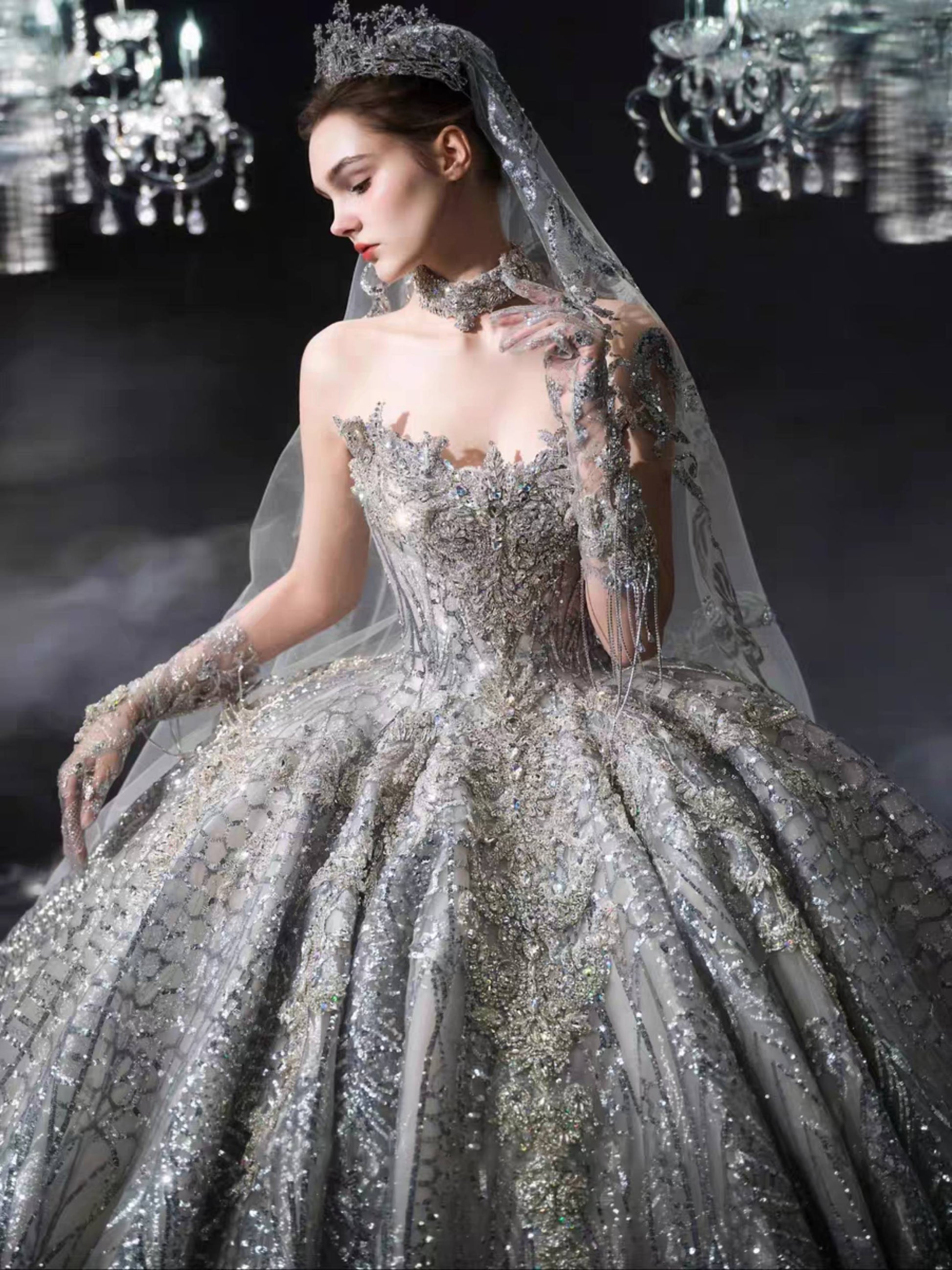 A sweeping cathedral train extends with dramatic elegance, and the veil — light as mist beneath chandeliers — shimmers with ethereal brilliance. Every detail is a testament to majesty, designed to capture both reverence and awe