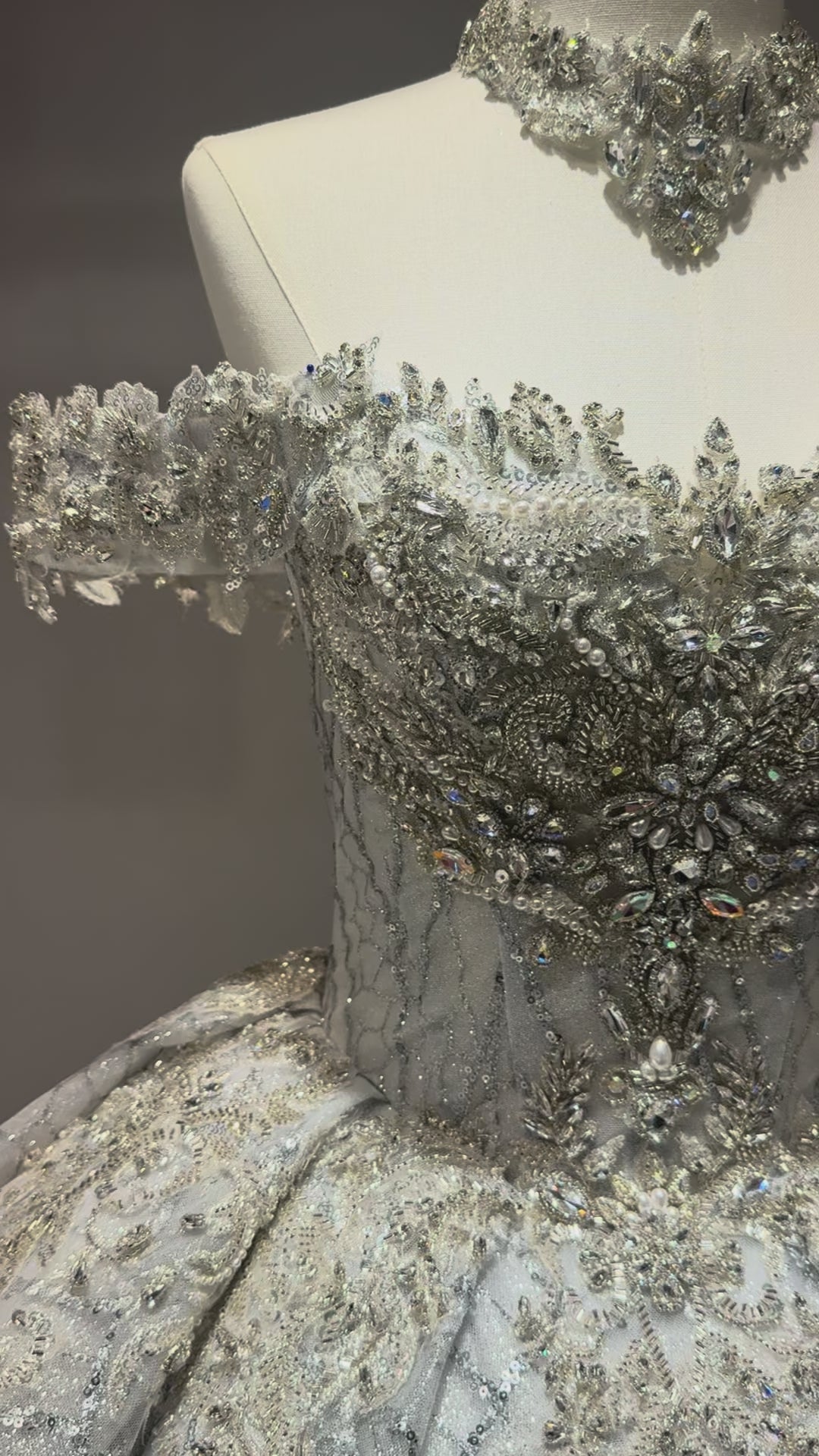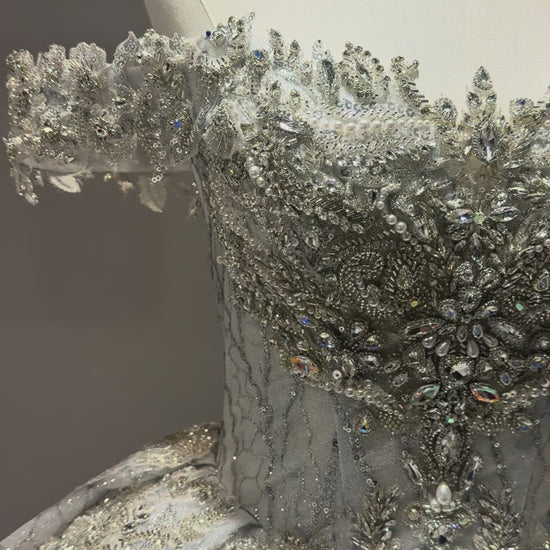 Commanding yet graceful, Artemisia evokes the timeless grandeur of a royal portrait. The sculpted bodice, adorned with intricate embroidery and crystal accents, crowns the bride in regal poise, while cascades of silver-threaded lace unfold into a luminous ballgown of breathtaking scale