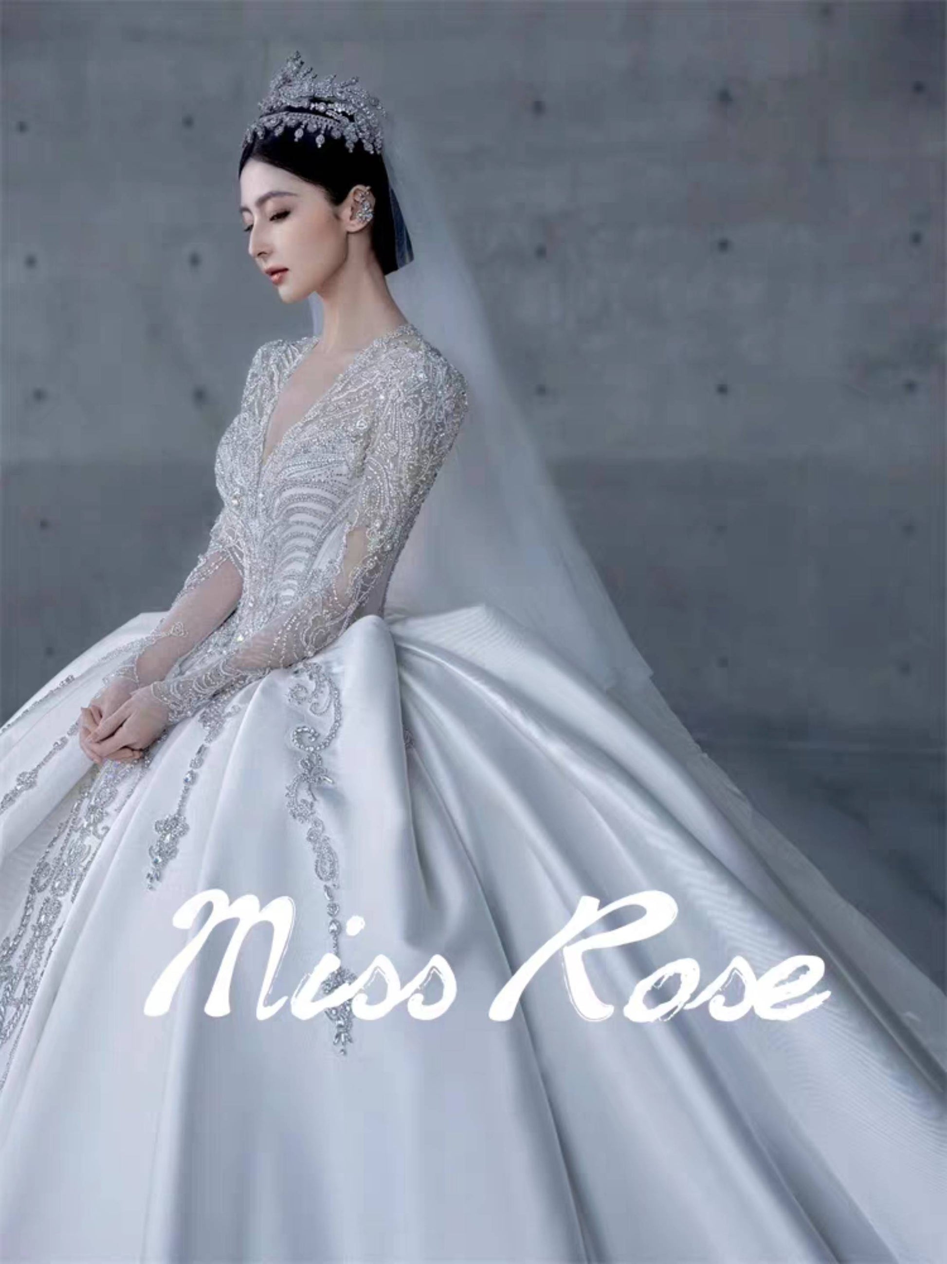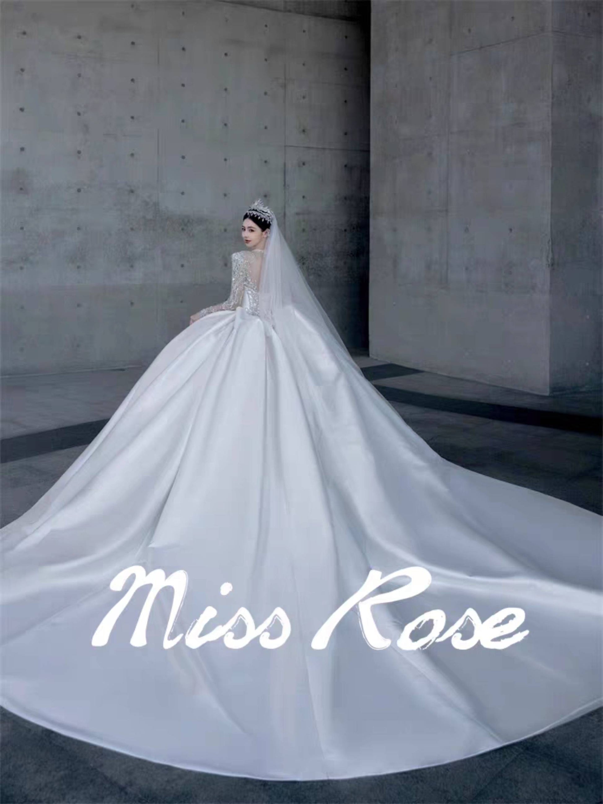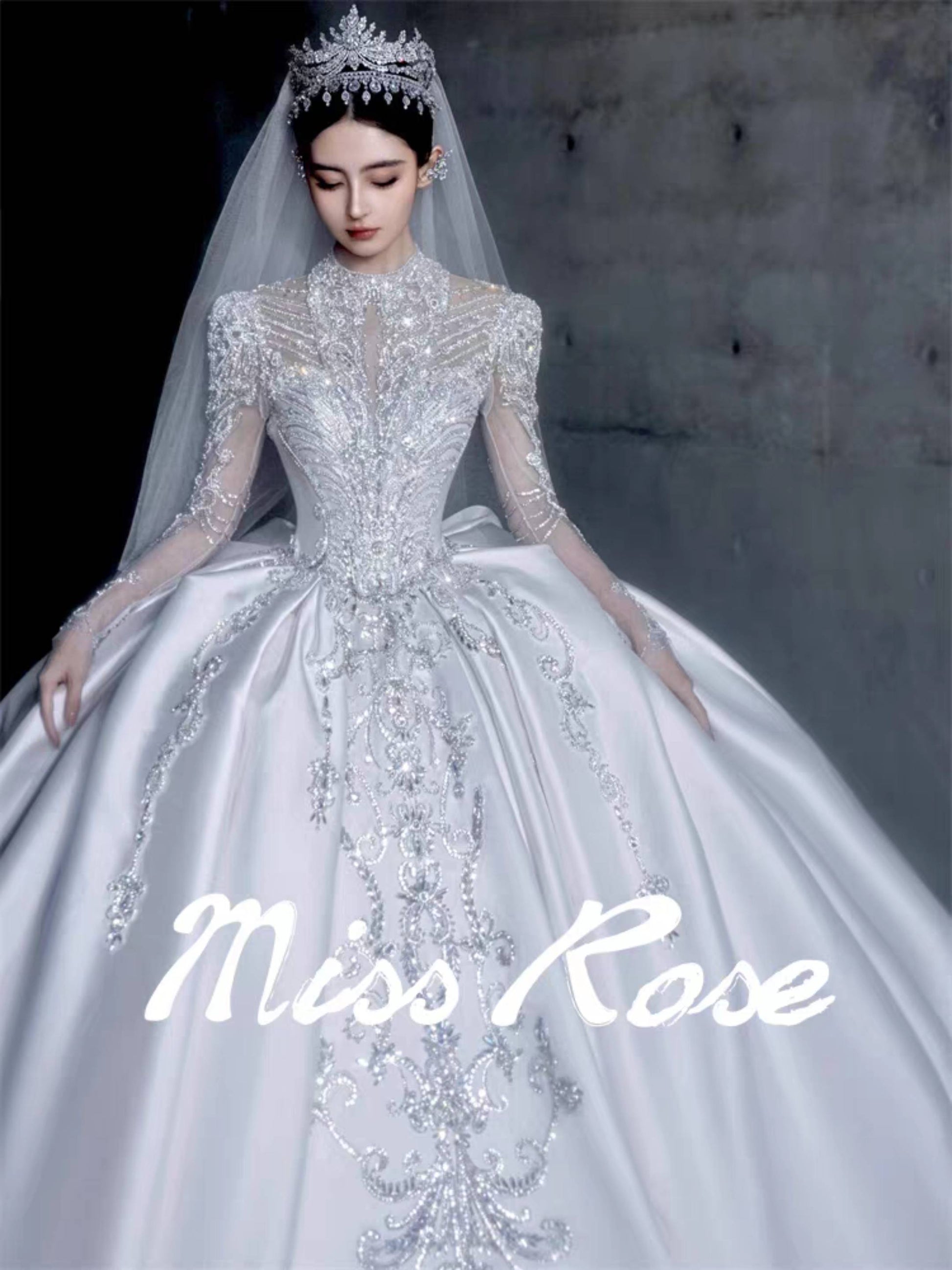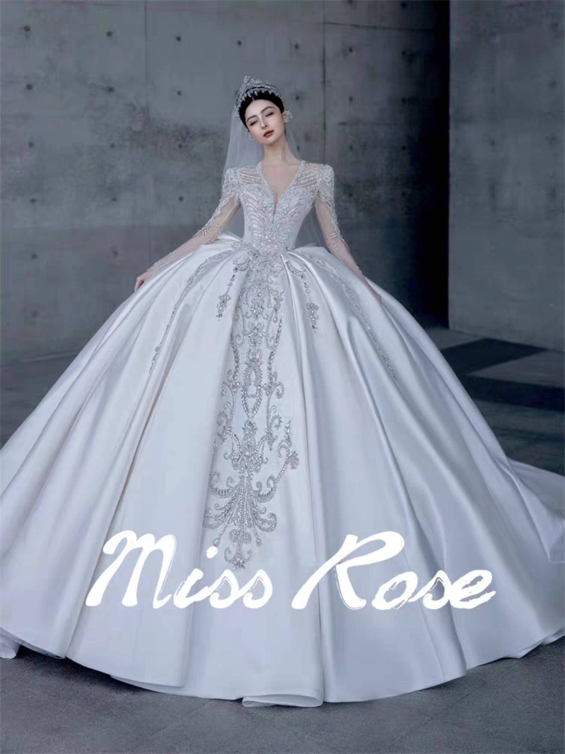 The bodice shimmers with subtle beadwork and embroidery, drawing the eye upward in graceful detail, while the expansive satin skirt flows in pure, uninterrupted beauty