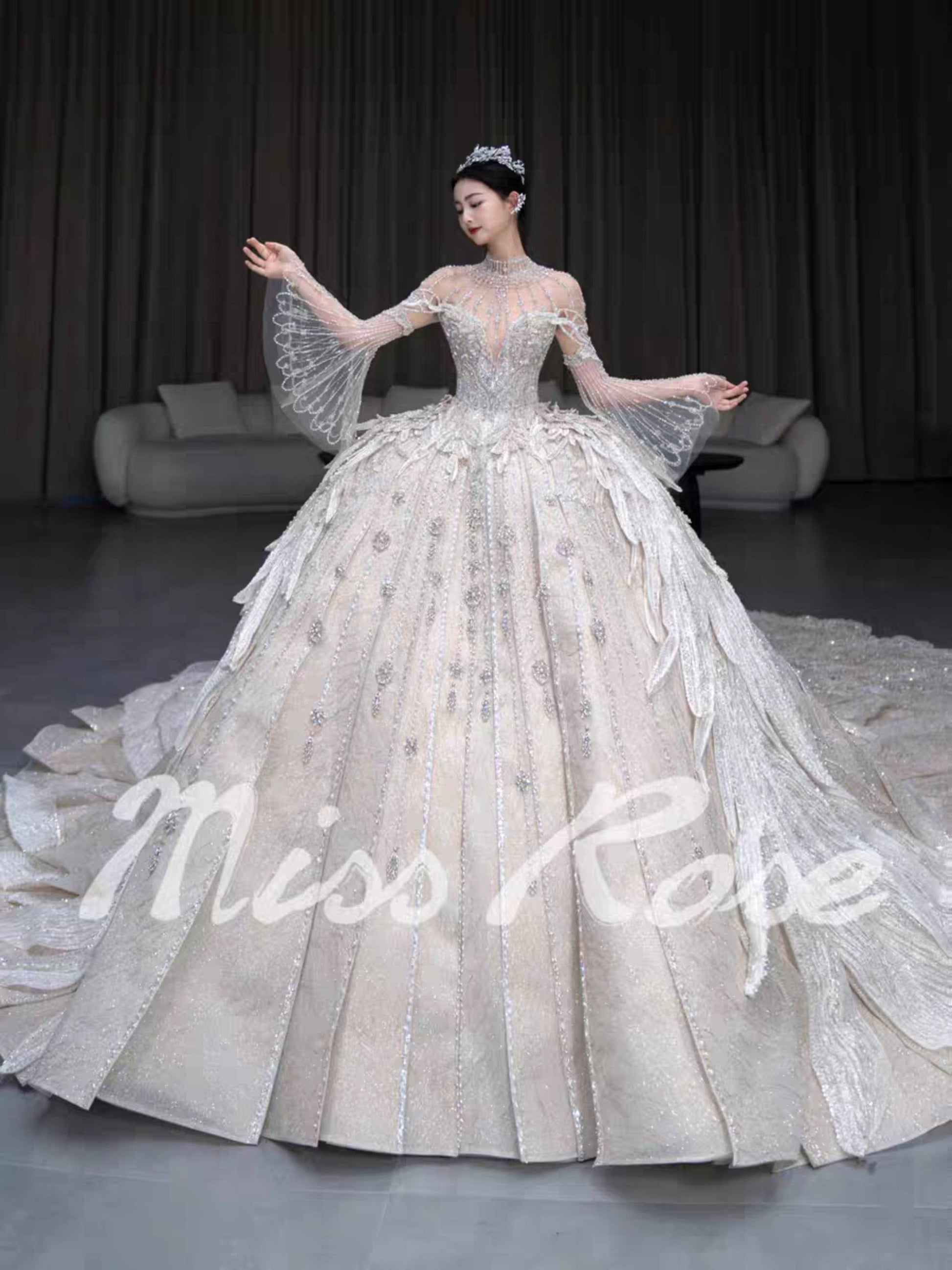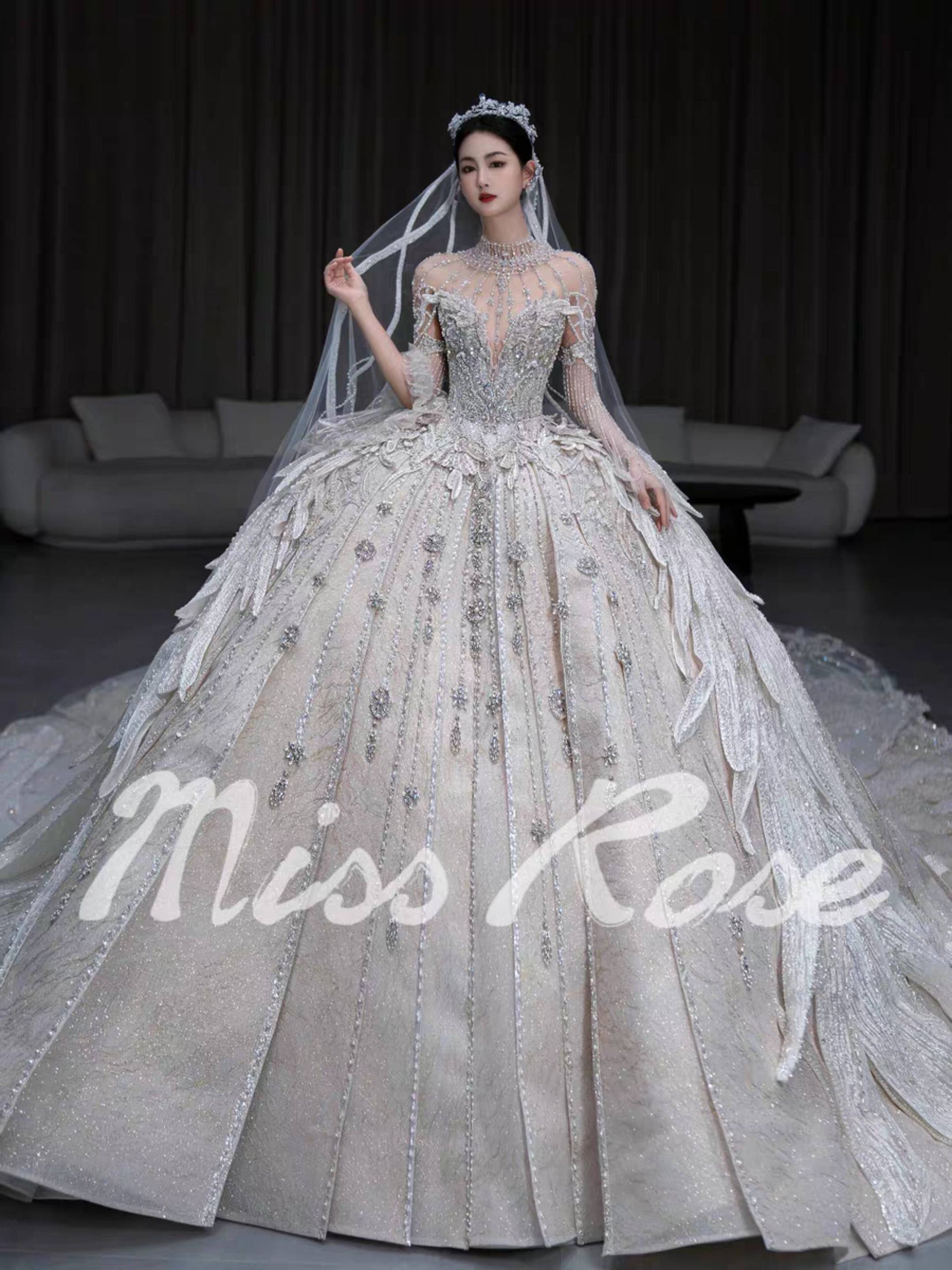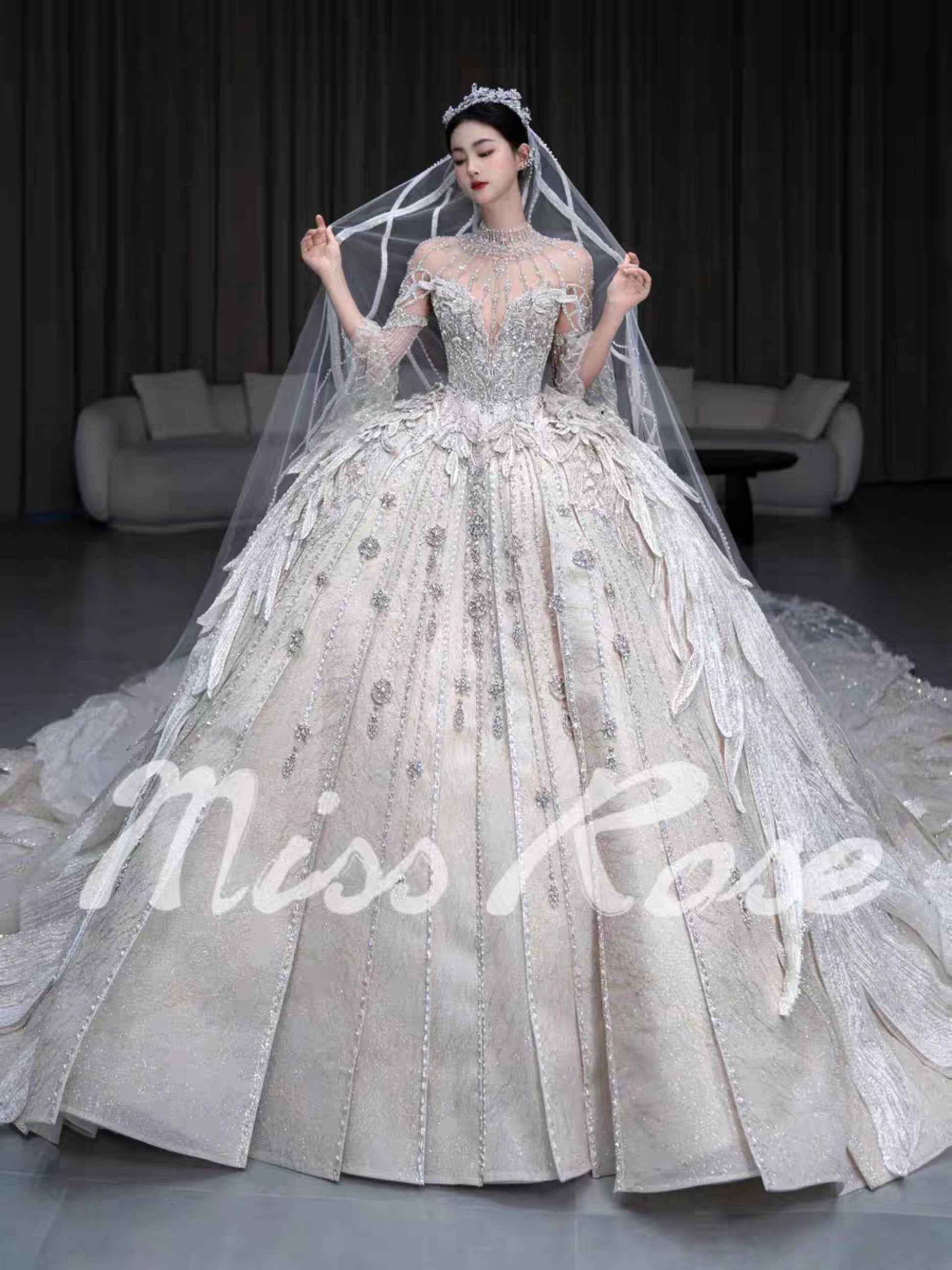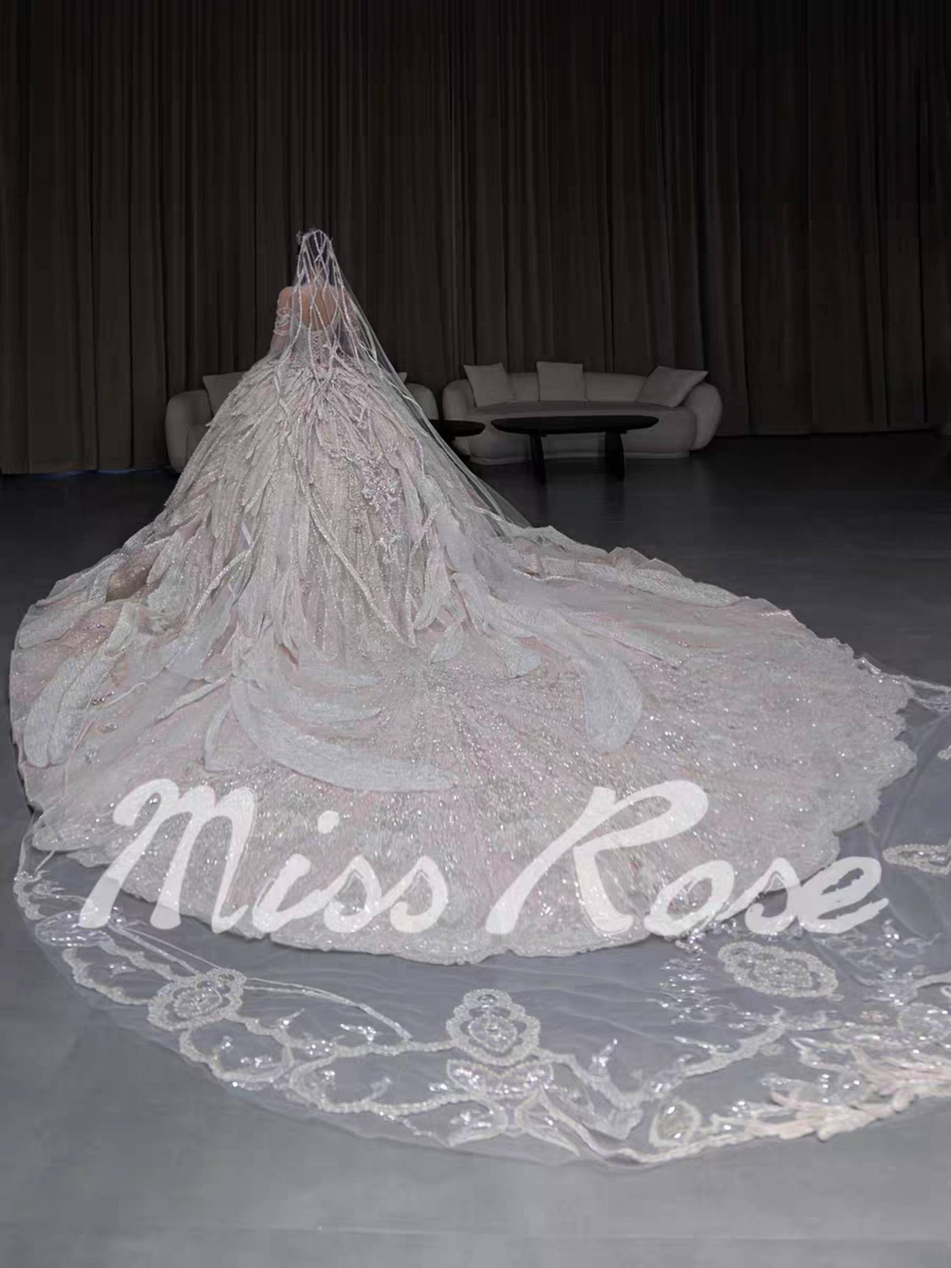 A sculpted bodice shimmers with hand-embroidered details, flowing seamlessly into a voluminous skirt that glows with silver-threaded lace. Its cathedral train unfurls with the grandeur of a royal procession, while the veil drifts softly behind, luminous as morning mist touched by the sun