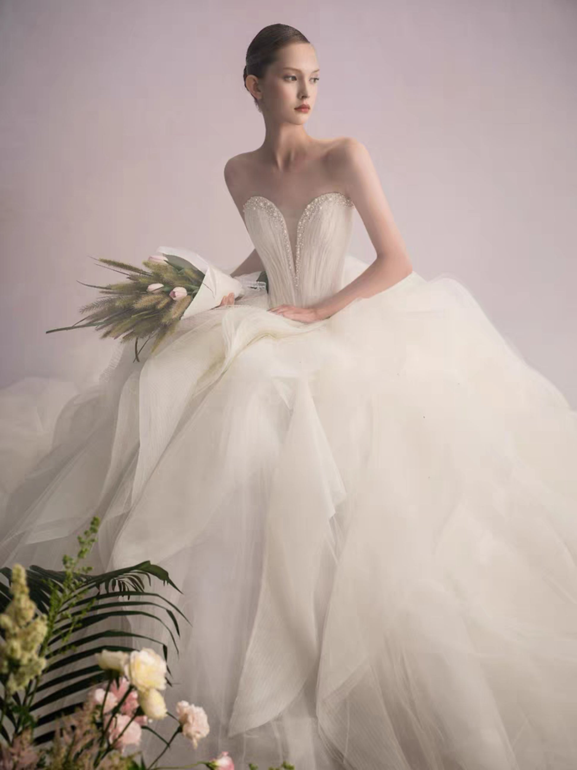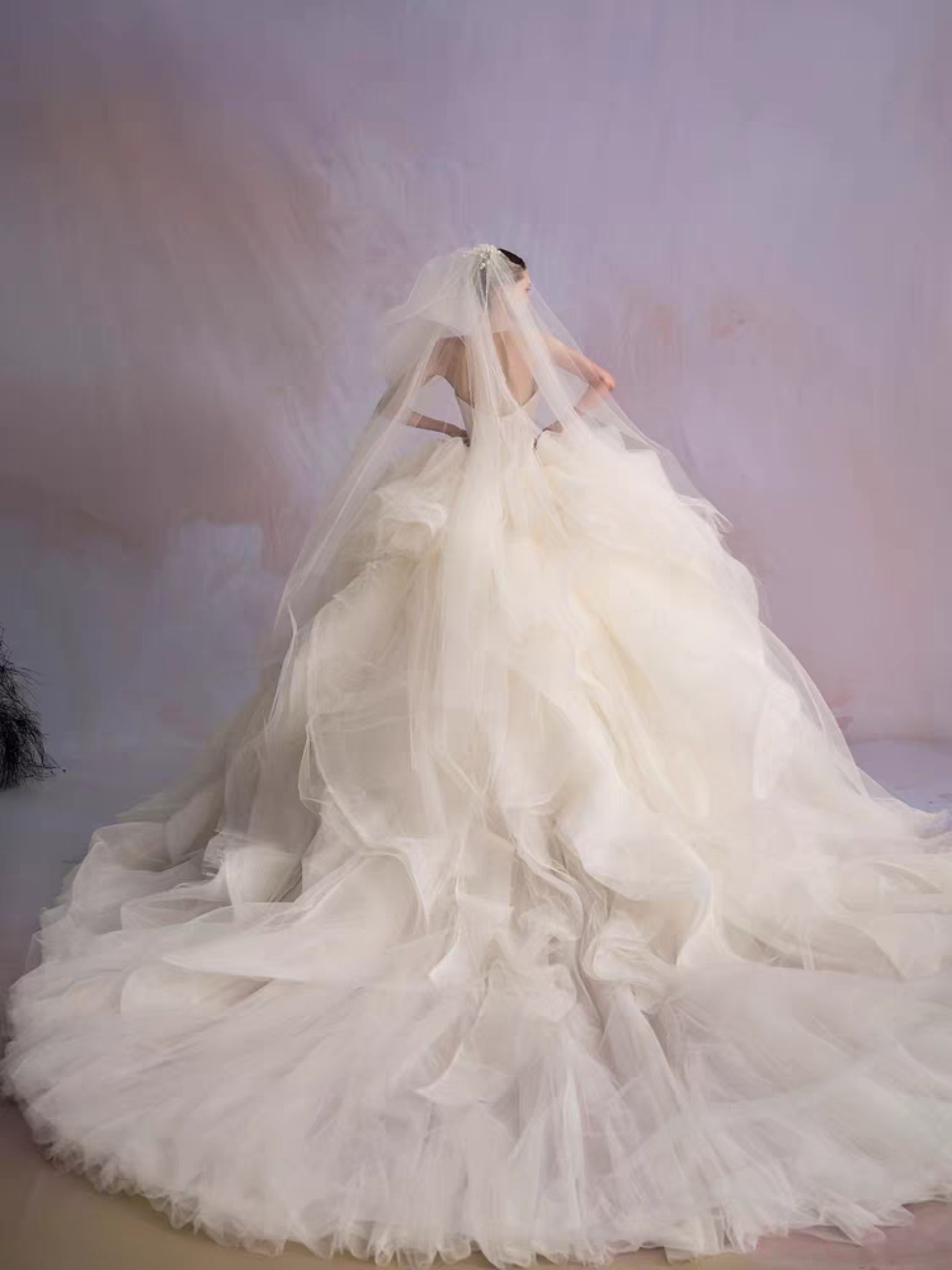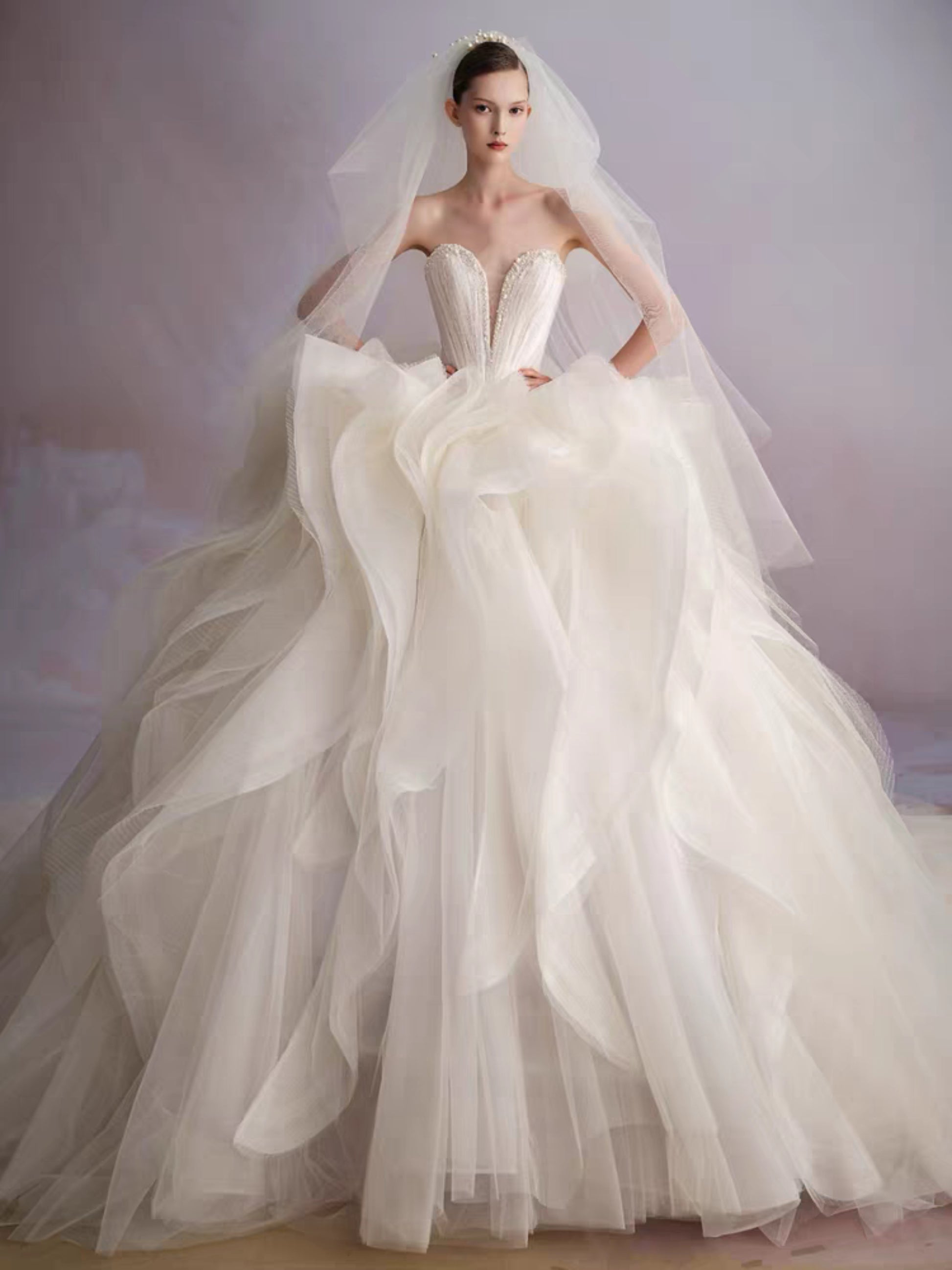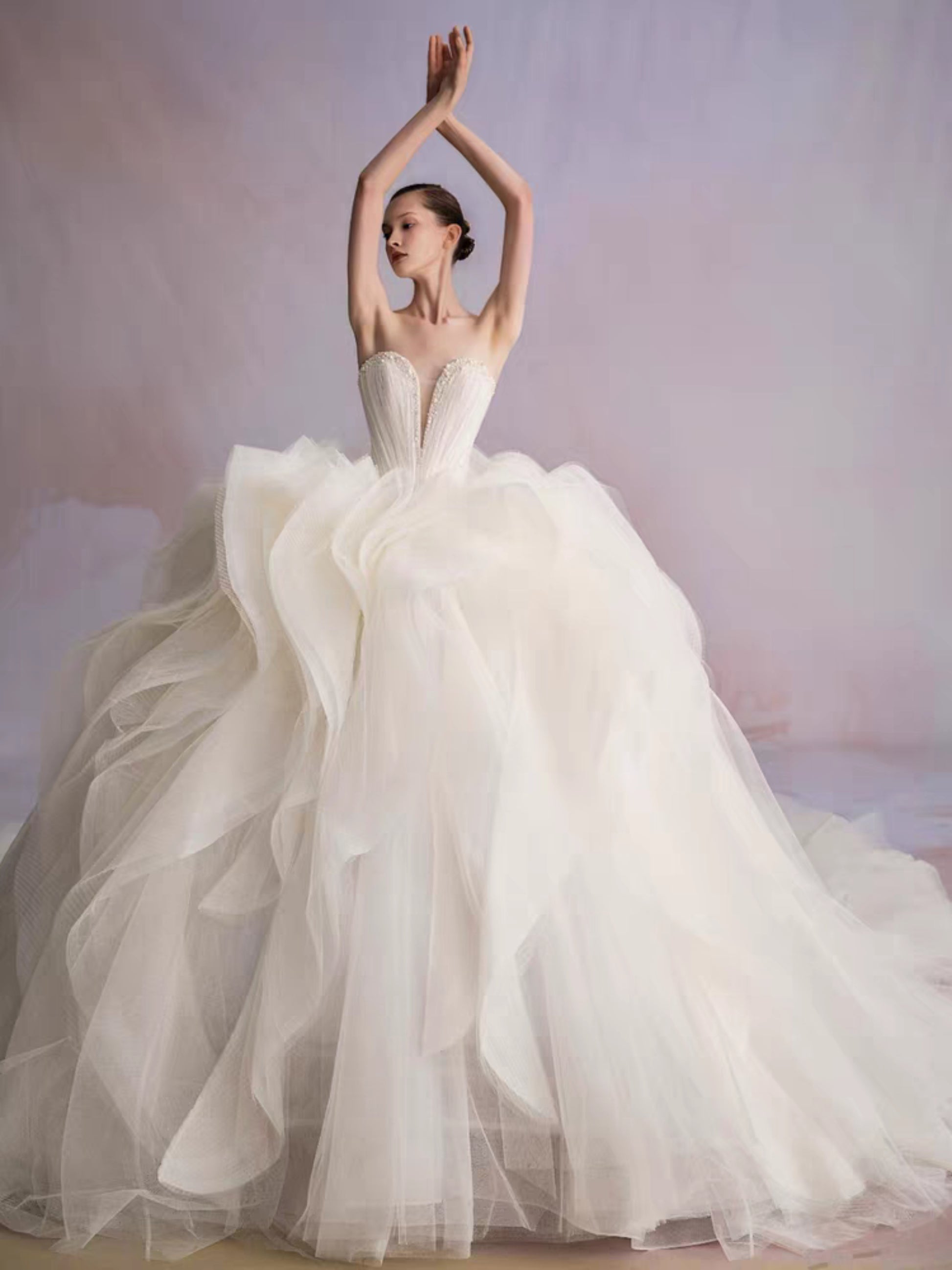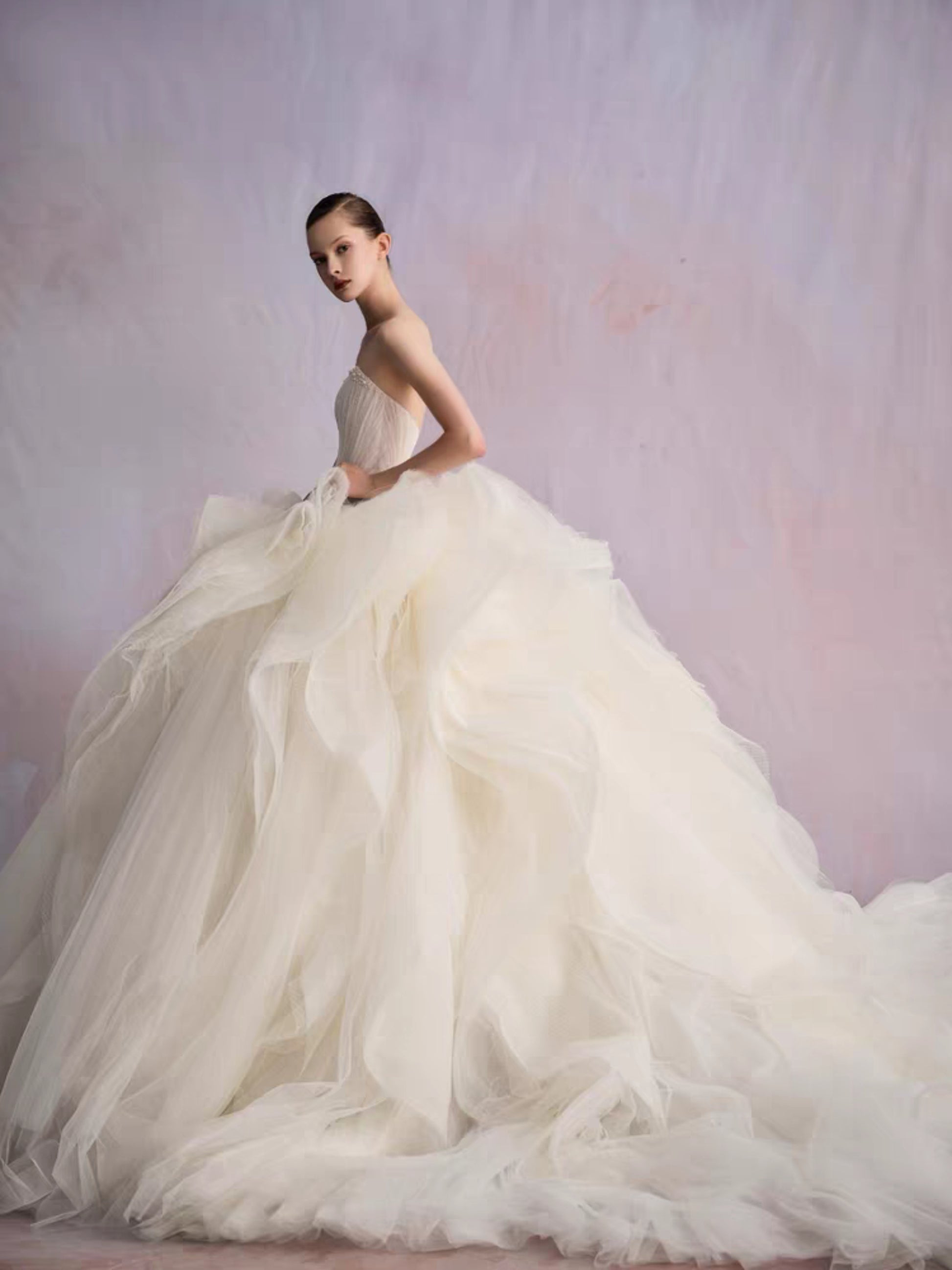 The bodice, sculpted with exacting precision, flows seamlessly into a skirt of tulle that rises and falls like captured waves. Every curve, every pleat, is deliberate, creating a gown alive with texture and movement. The cathedral train extends in sculptural layers, carrying light and shadow in its every fold
