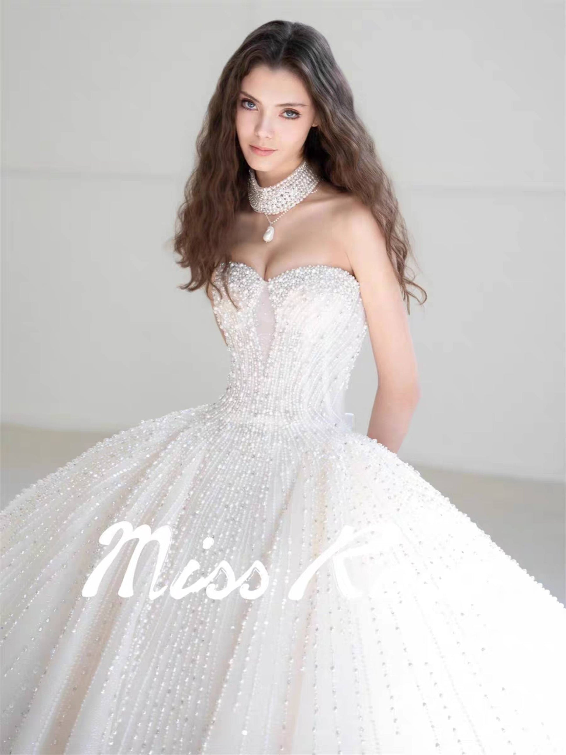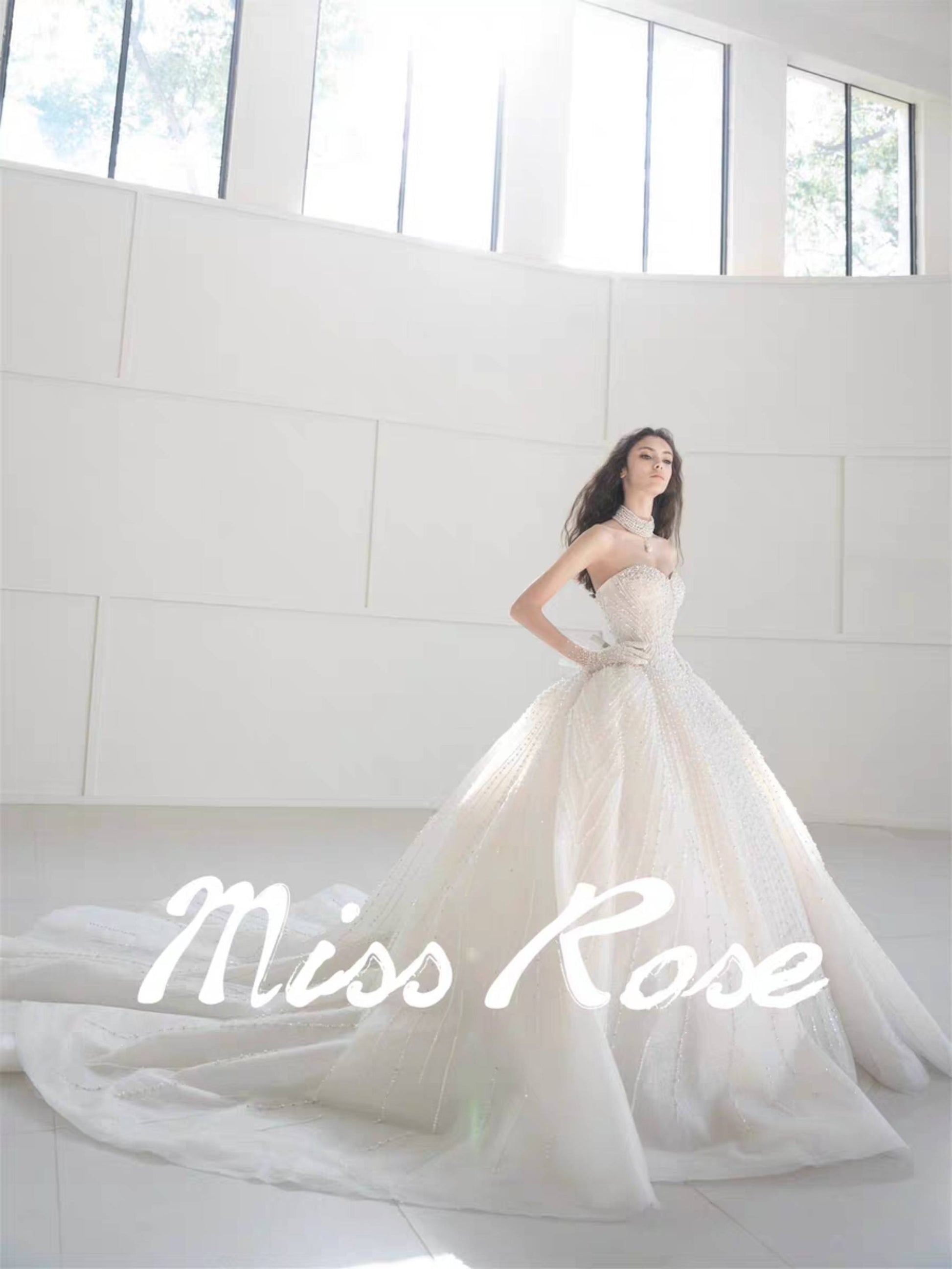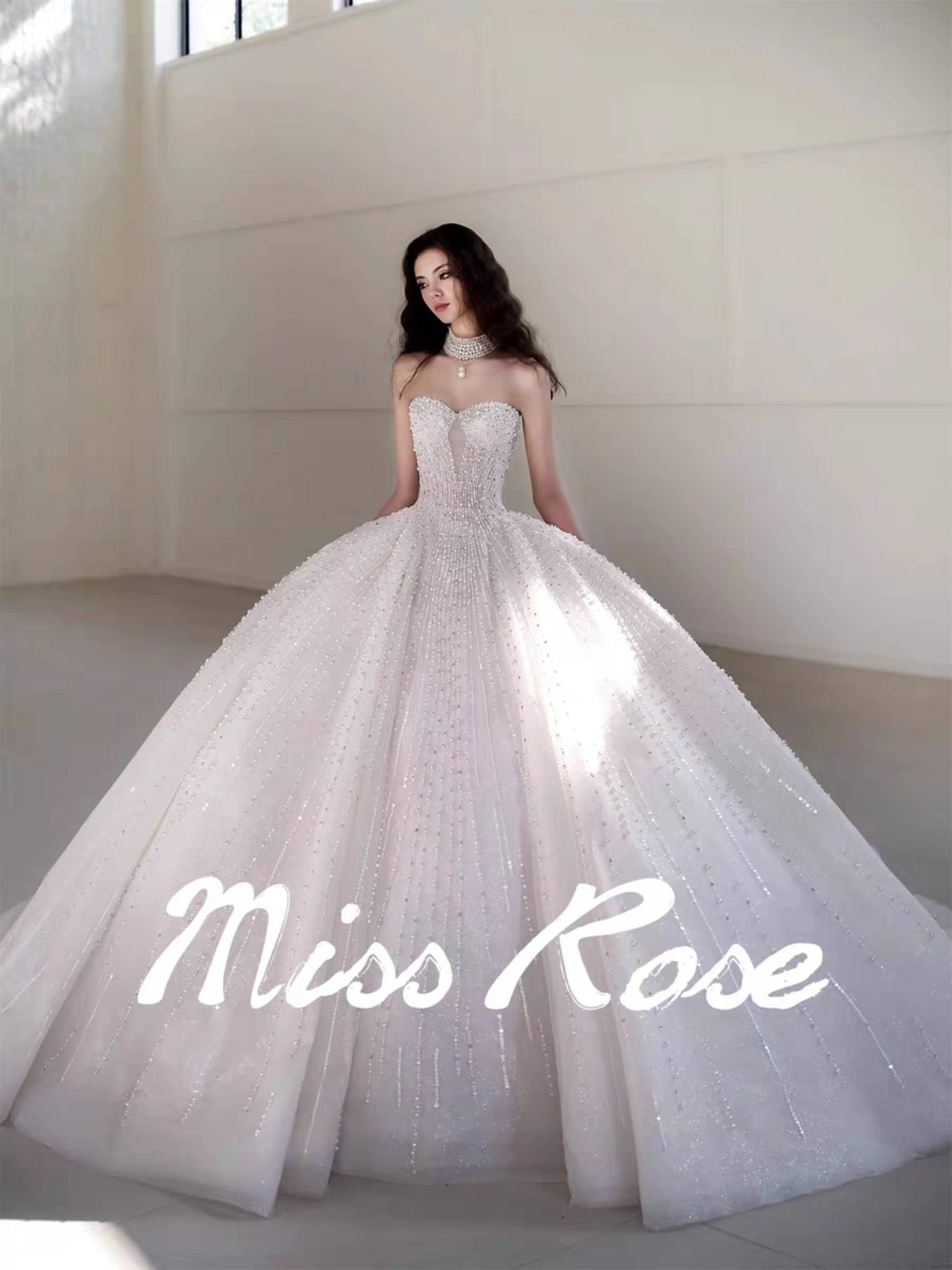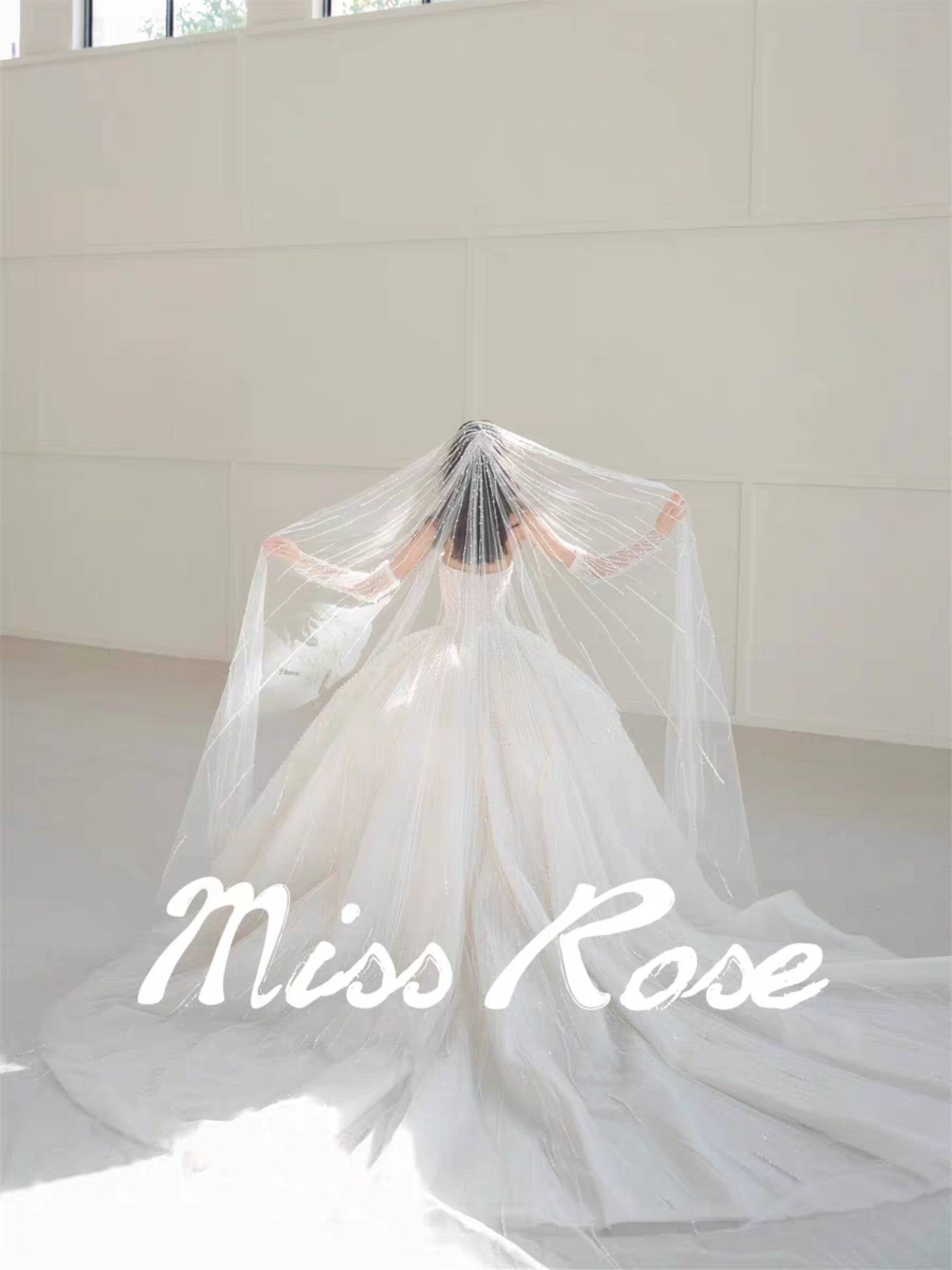 Its sweetheart bodice shimmers with hand-beaded crystals and lace appliqué, catching each glimmer of the day as if kissed by dawn, while silver-thread embroidery unfurls across the skirt like blossoms in bloom, cascading into a soft, sweeping train that glows like moonlight upon water