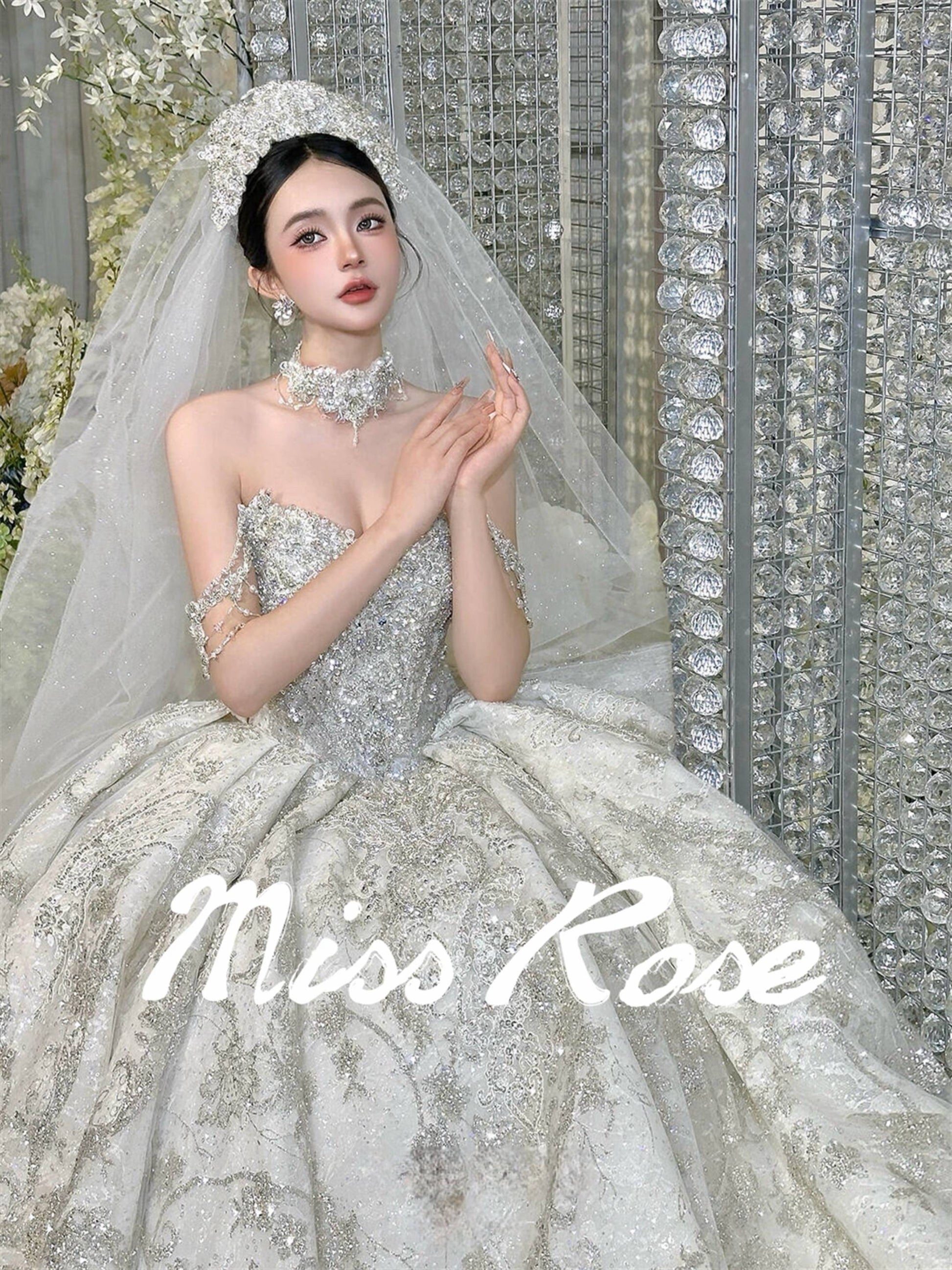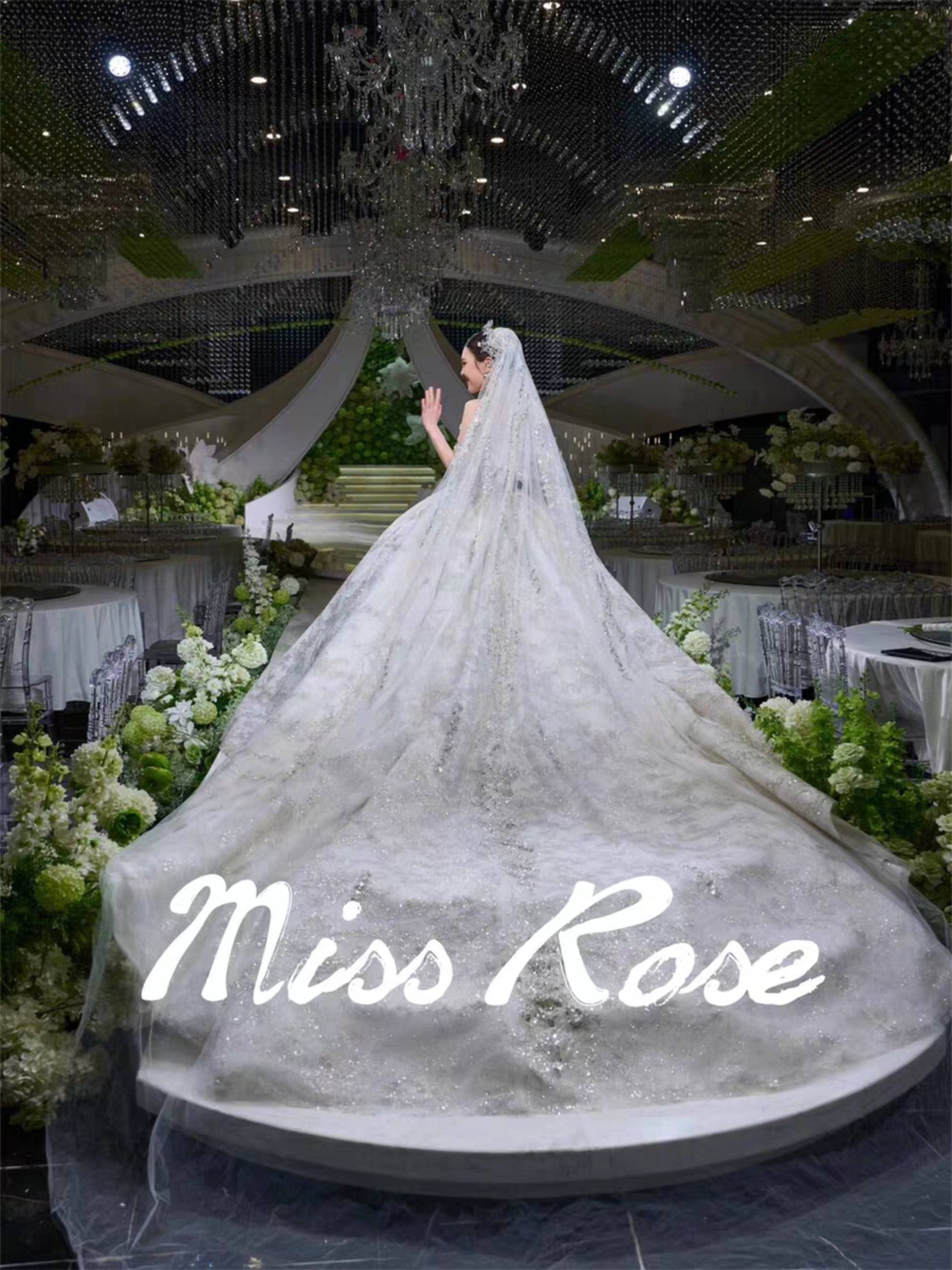 Silver-threaded embroidery blossoms across the flowing skirt, cascading into a train that glows like moonlight upon water