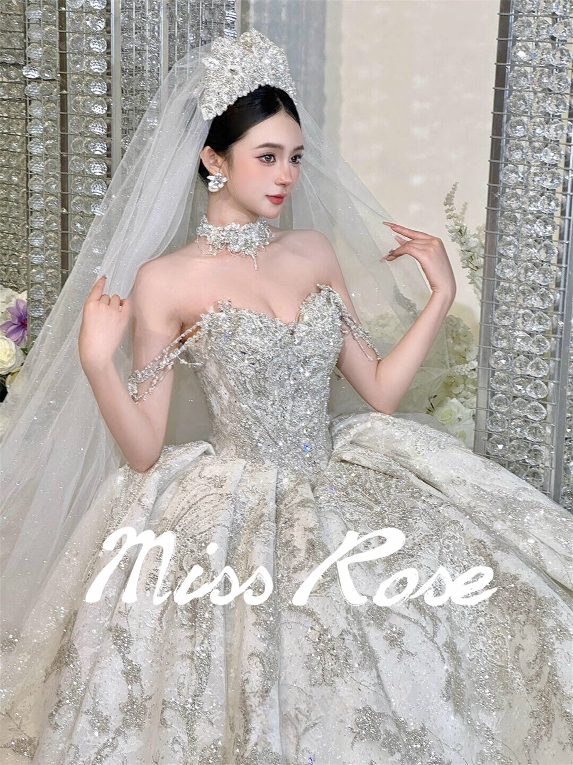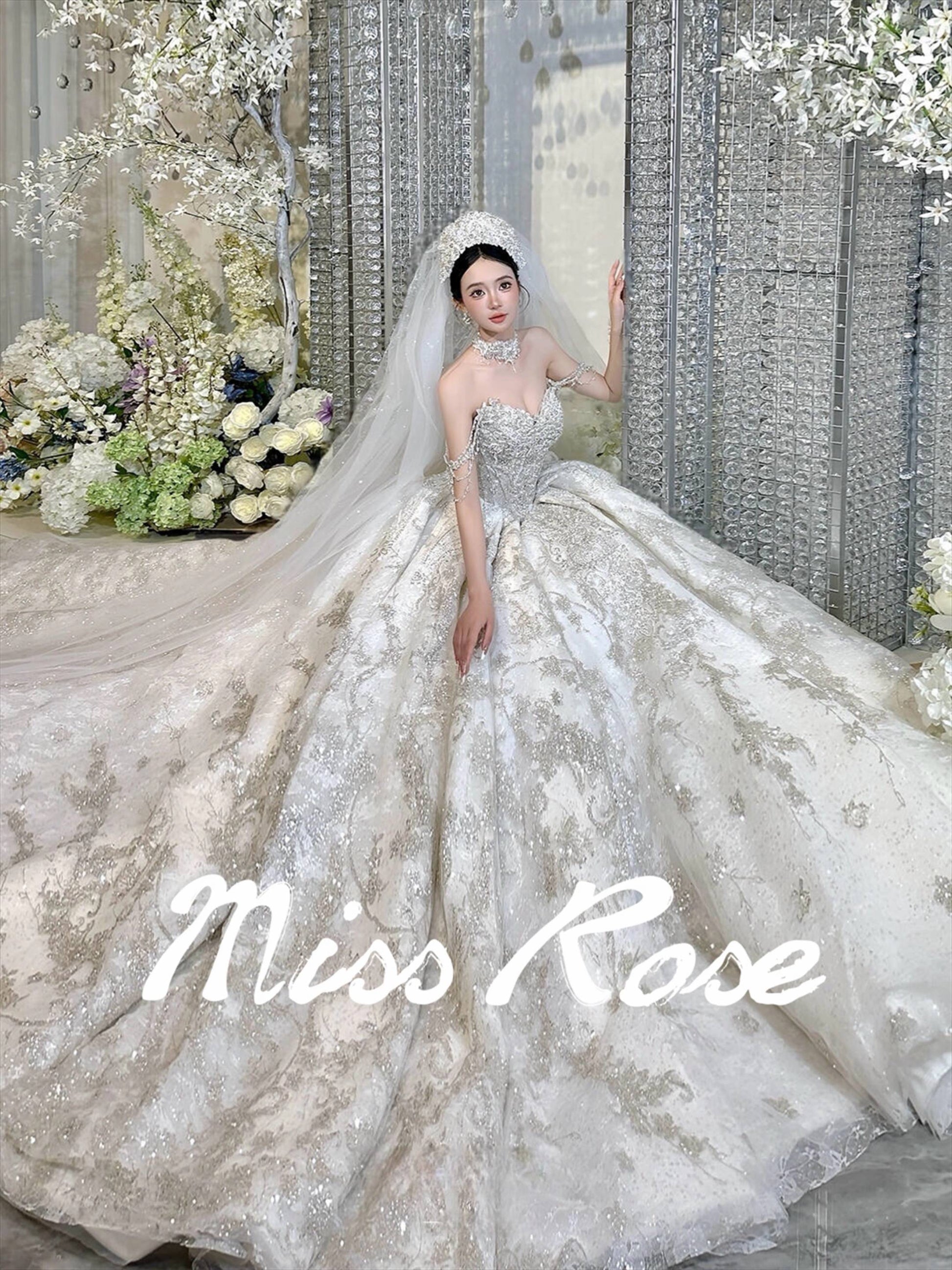 A gown that shimmers with celestial grace, its sweetheart bodice adorned with lace appliqué and crystal beadwork that catches every whisper of light