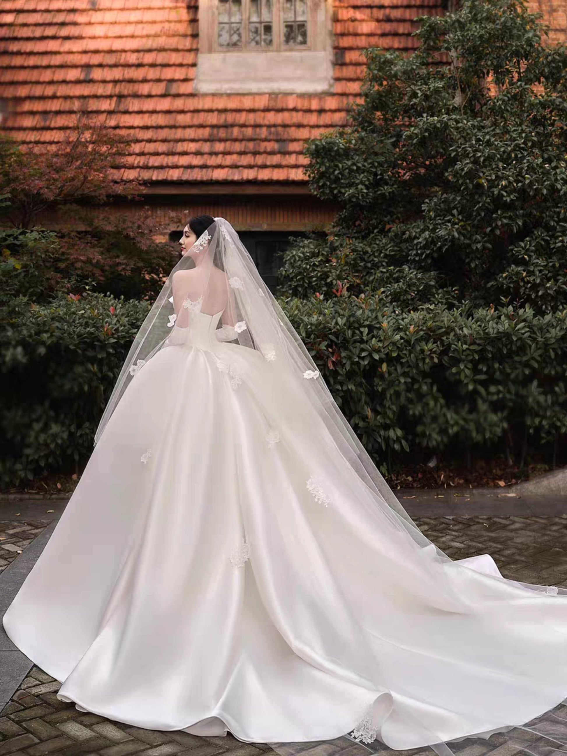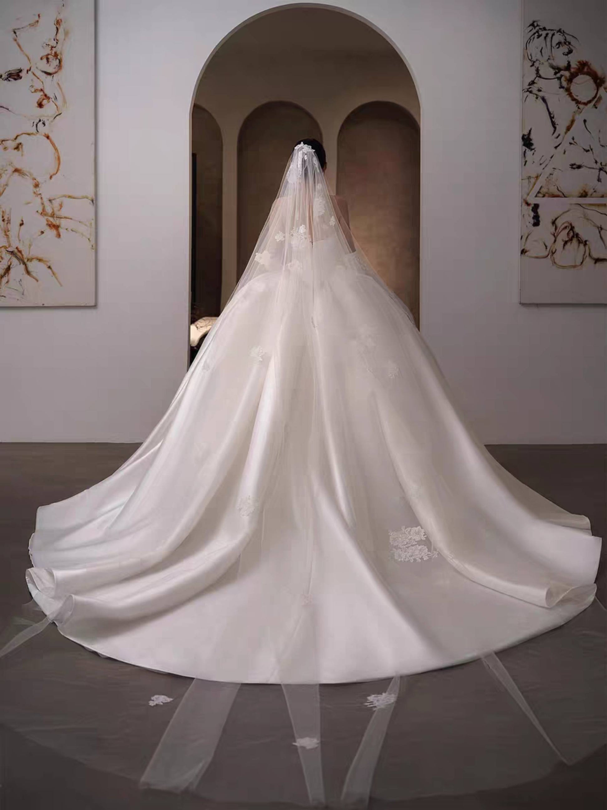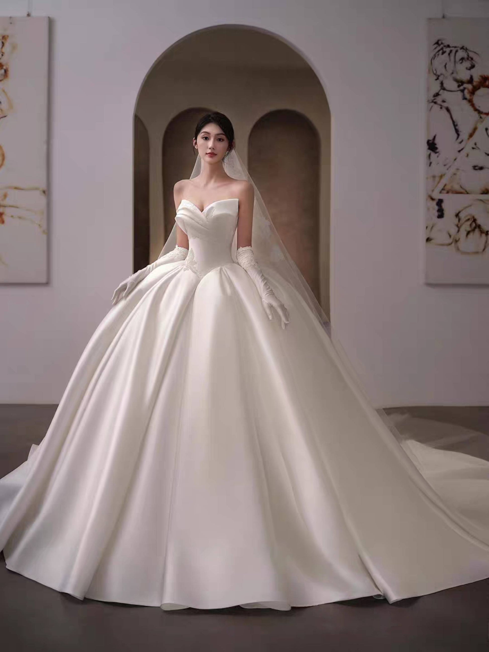 The skirt unfolds in sweeping volumes, a sea of satin that gleams with soft light, its grandeur born not from embellishment but from form itself