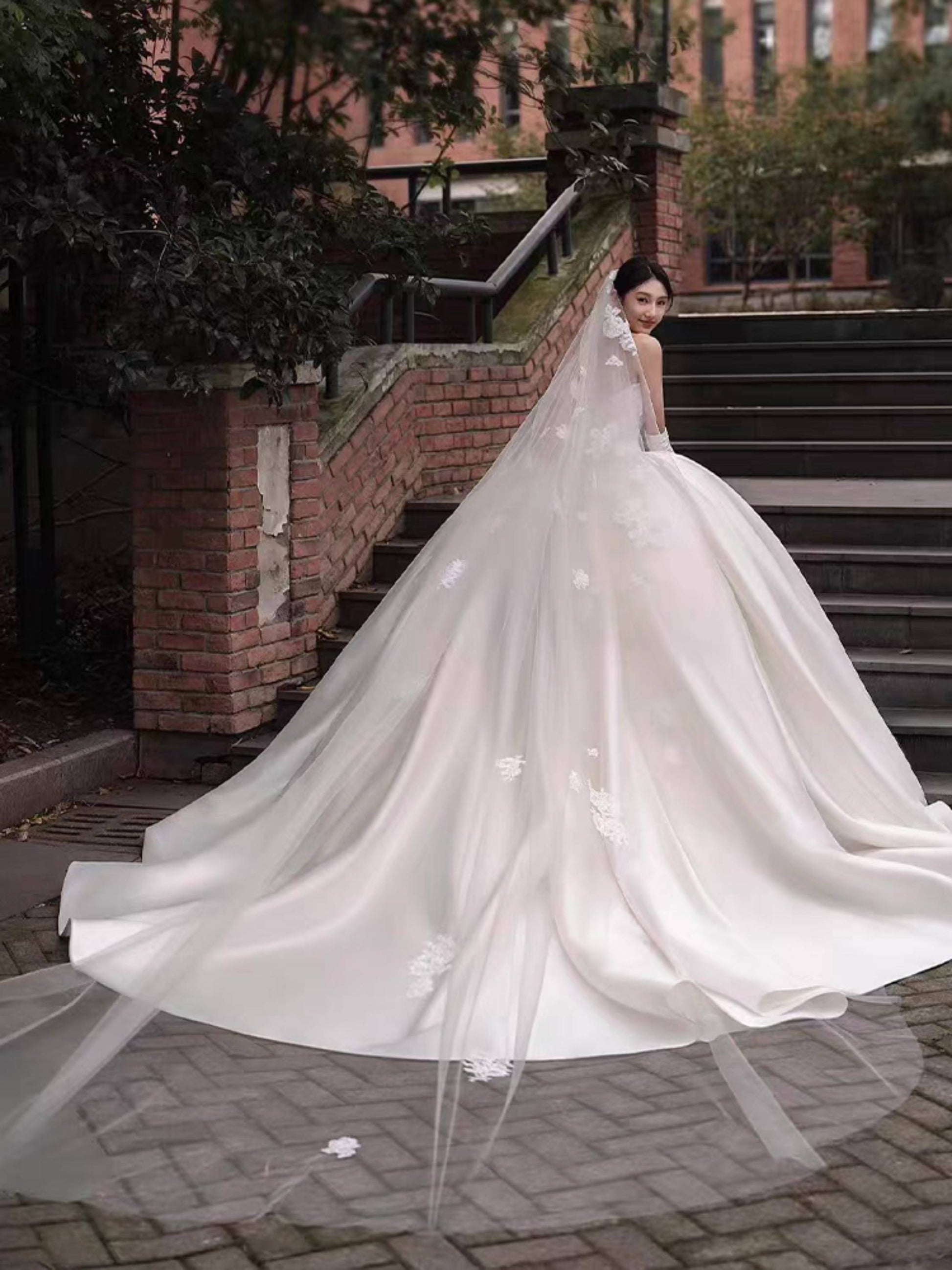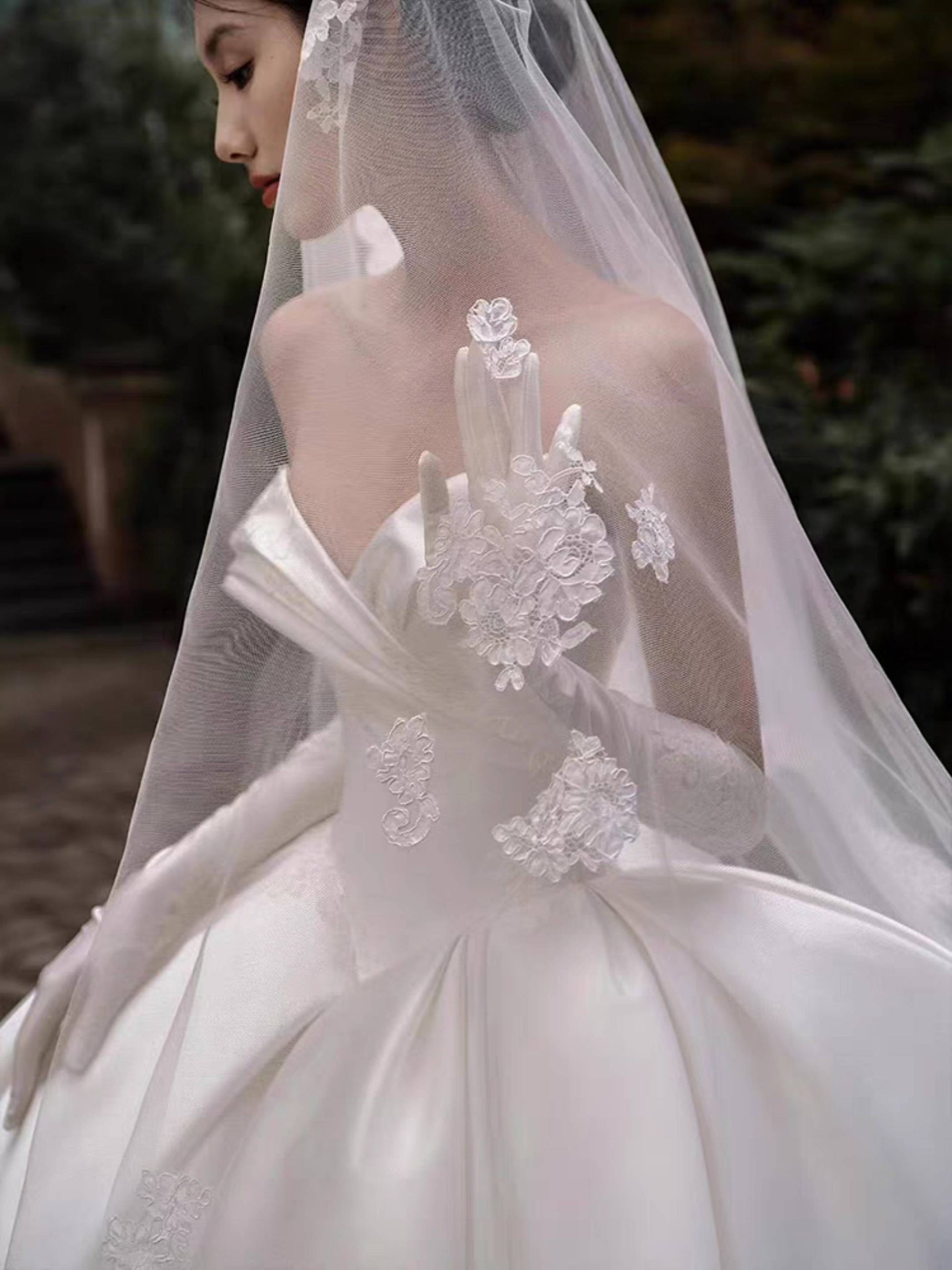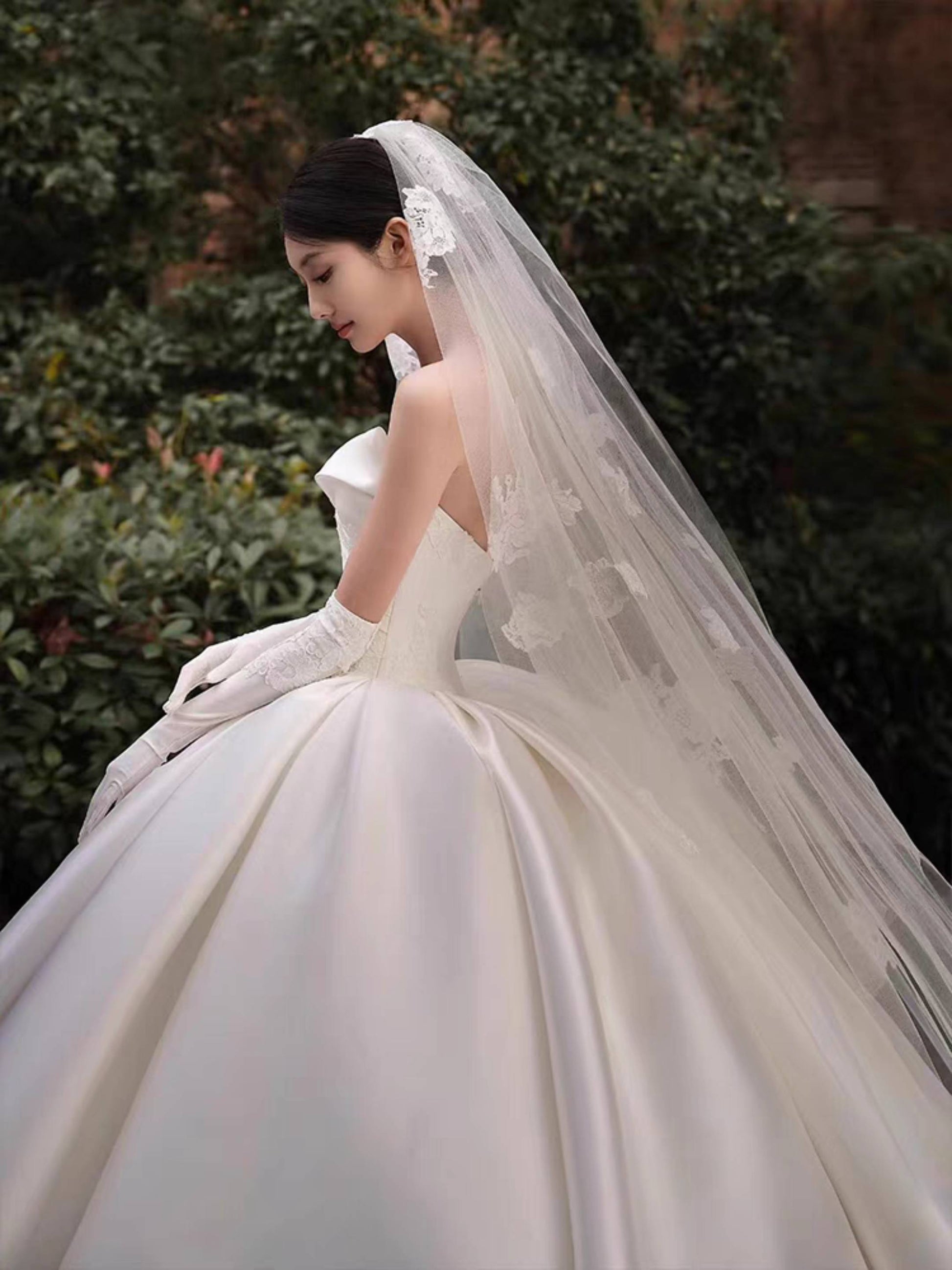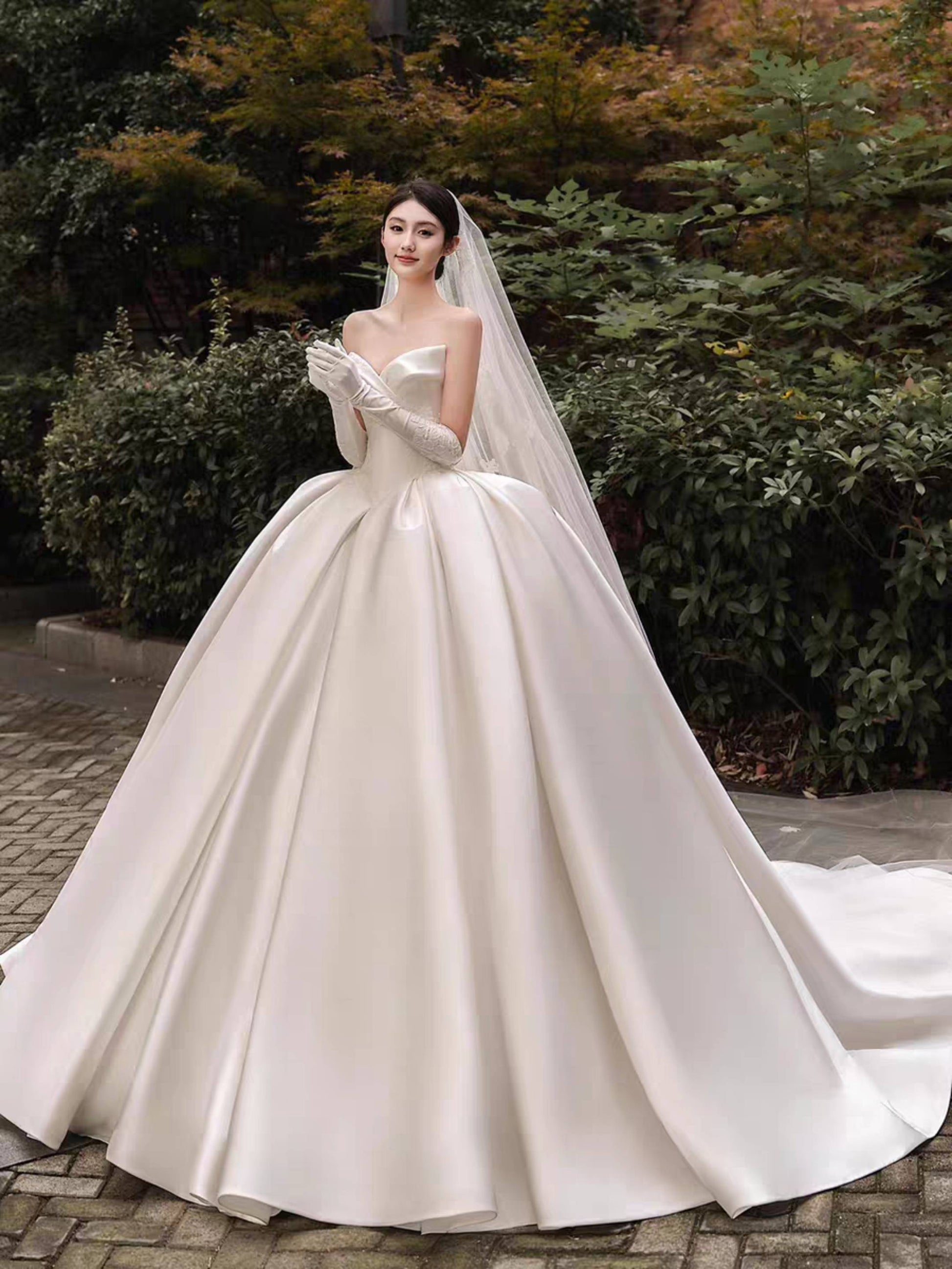 The skirt unfolds in sweeping volumes, a sea of satin that gleams with soft light, its grandeur born not from embellishment but from form itself
